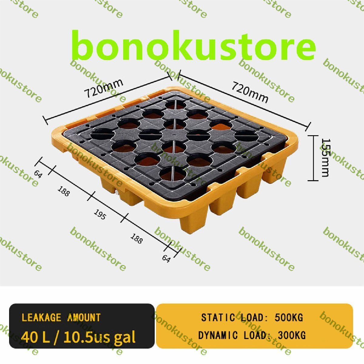 名前: 漏れ防止トレイ 静荷重:500kg 動荷重:300kg 材質:ポリエチレン 用途:スタッキング、陸上輸送、防湿 製品サイズ: 72x72x15.5cm 含む: 漏れ防止トレイ×1