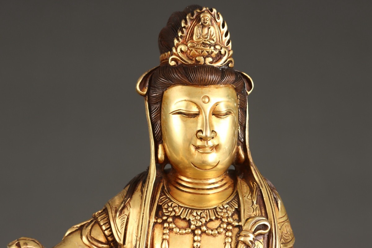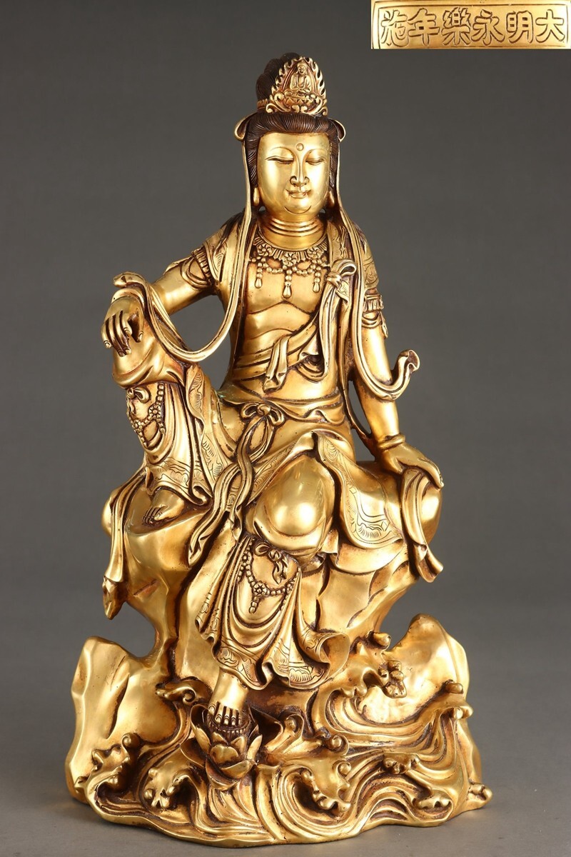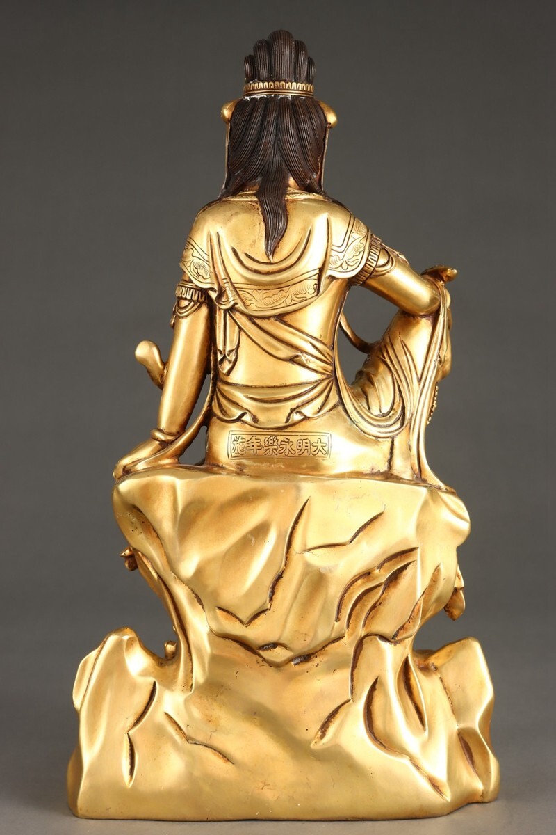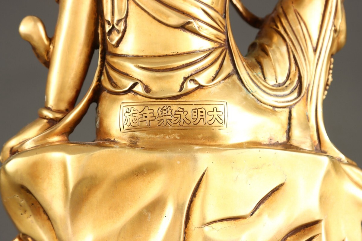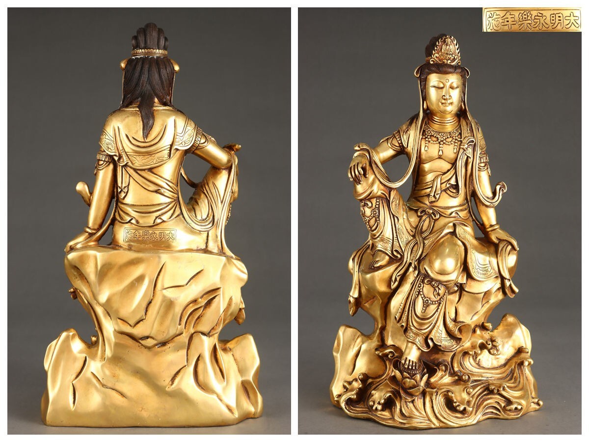 明代 大明永楽年施款 金水厚重 古銅彫 塗金水月観音坐像【仁】古置物擺件 銅仏像 仏教文化 古美術 蔵出
