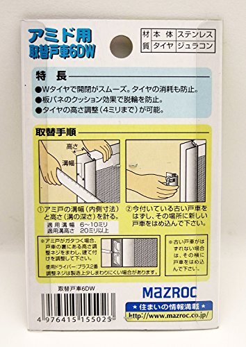 「マツ六(Mazroc) アミド用 取替戸車 6DW 15502」▼4976415155023▼(商品説明)アミド用 6DW-/-/15502・パッケージ個数:1・適用溝高さ:20ミリ以上・適用溝幅:6~10ミリ特長 ●Wタイヤで開閉がスムーズ。タイヤの消耗も防止。 ●板バネのクッションで脱輪を防止。 ●タイヤの高さ調整(4ミリまで)が可能。
