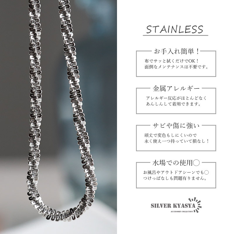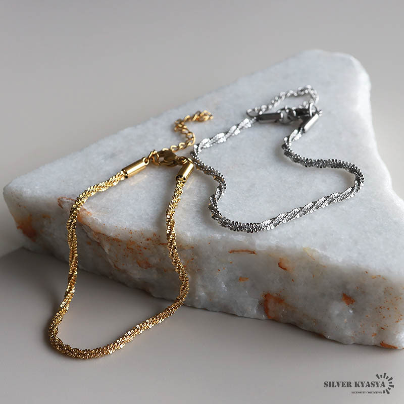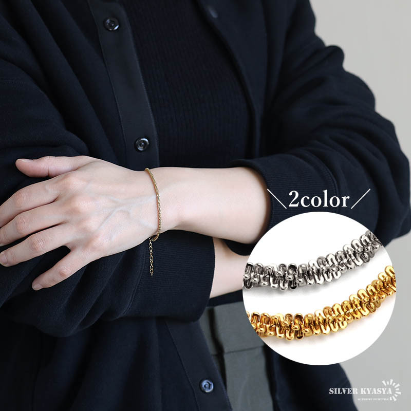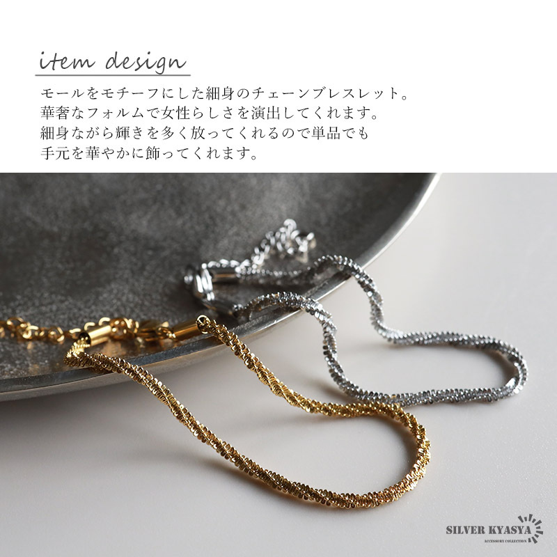 商品概要 | ■ITEM DESIGN モールをモチーフにした細身のチェーンブレスレット。華奢なフォルムで女性らしさを演出してくれます。細身ながら輝きを多く放ってくれるので単品でも手元を華やかに飾ってくれます。 ■ステンレス素材を使用 金属部分は頑丈なことで知られるステンレス素材を採用。耐久性はもちろん耐水性も高く水場での着用も可能。金属アレルギーも出にくいとされている金属です。 |