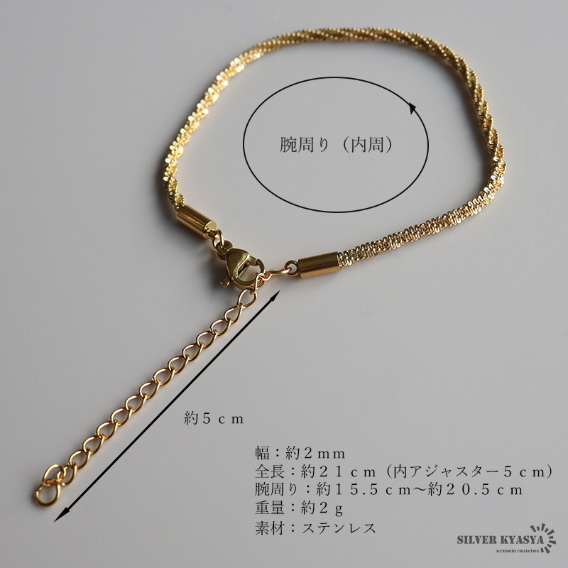 サイズ | 幅:約2mm 全長:約21cm(内アジャスター5cm) 腕周り:約15.5cm~約20.5cm 重量:約2g 参考:レディースモデル腕周り:14.5cm |