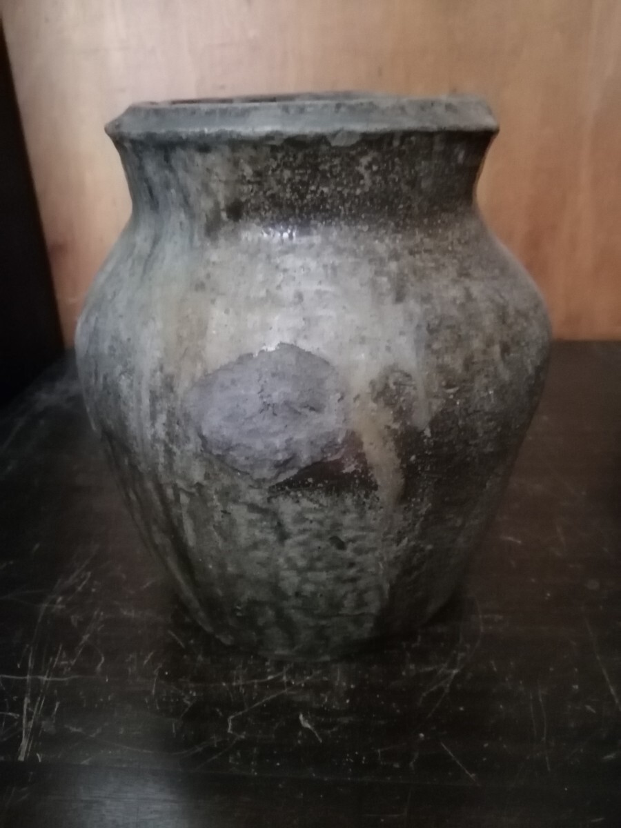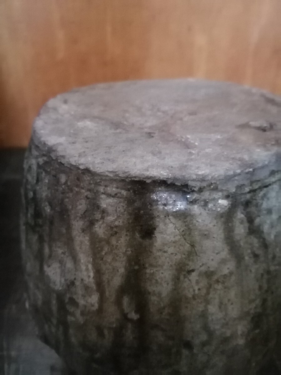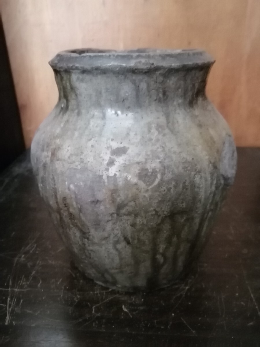 鎌倉期の常滑の種壺です。雄大な自然釉に被われ、中央にくっつきがあります。全身が苔に覆われた岩の風情で、古格ある姿です。