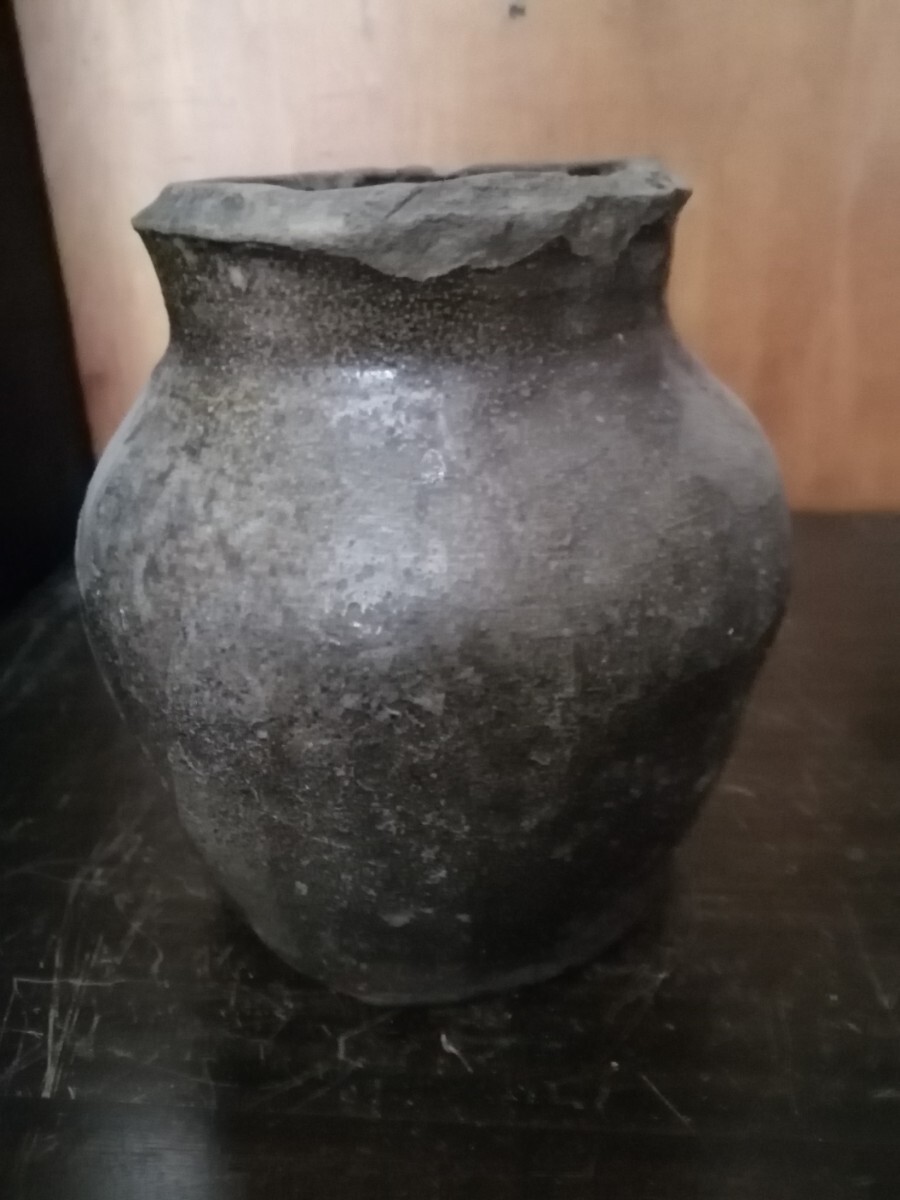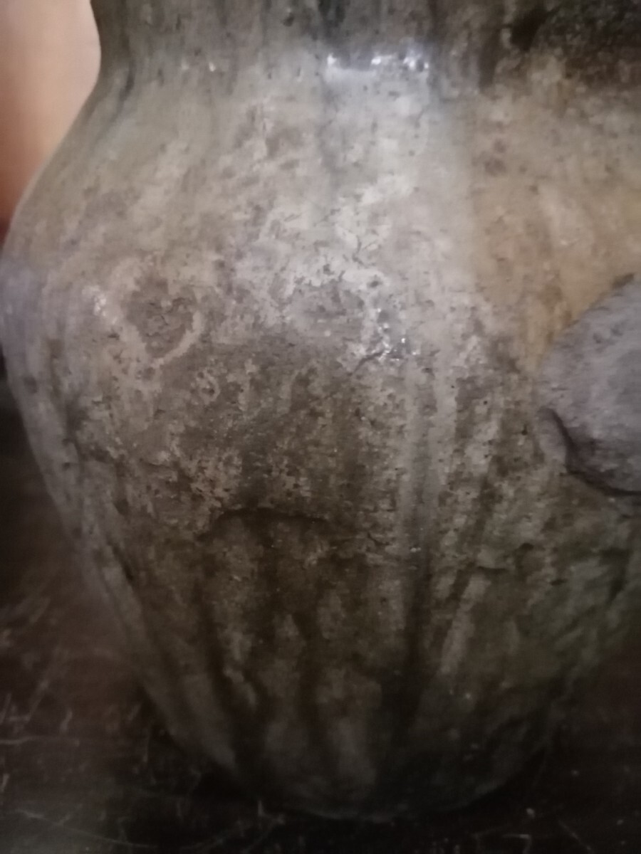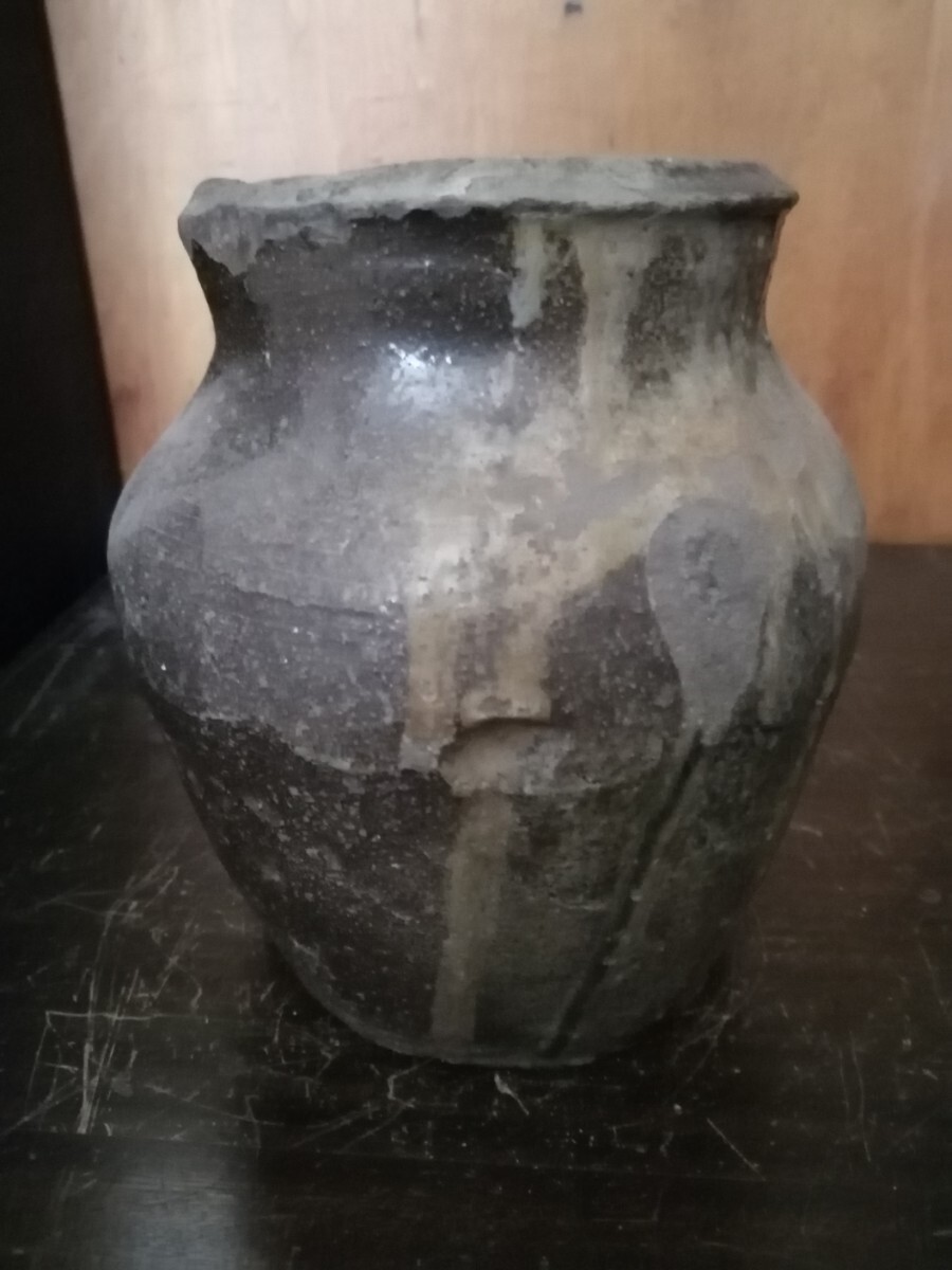 鎌倉期の常滑の種壺です。雄大な自然釉に被われ、中央にくっつきがあります。全身が苔に覆われた岩の風情で、古格ある姿です。