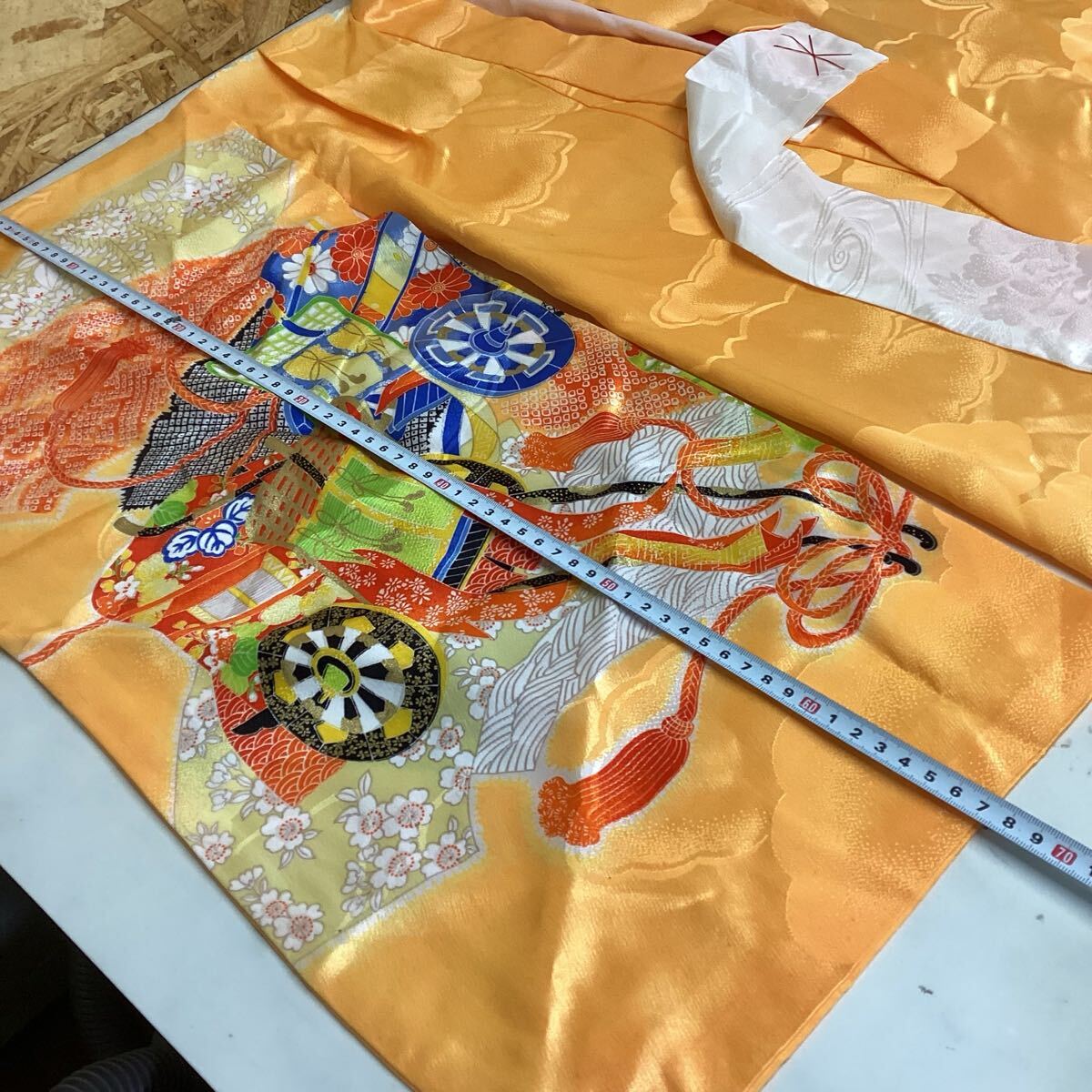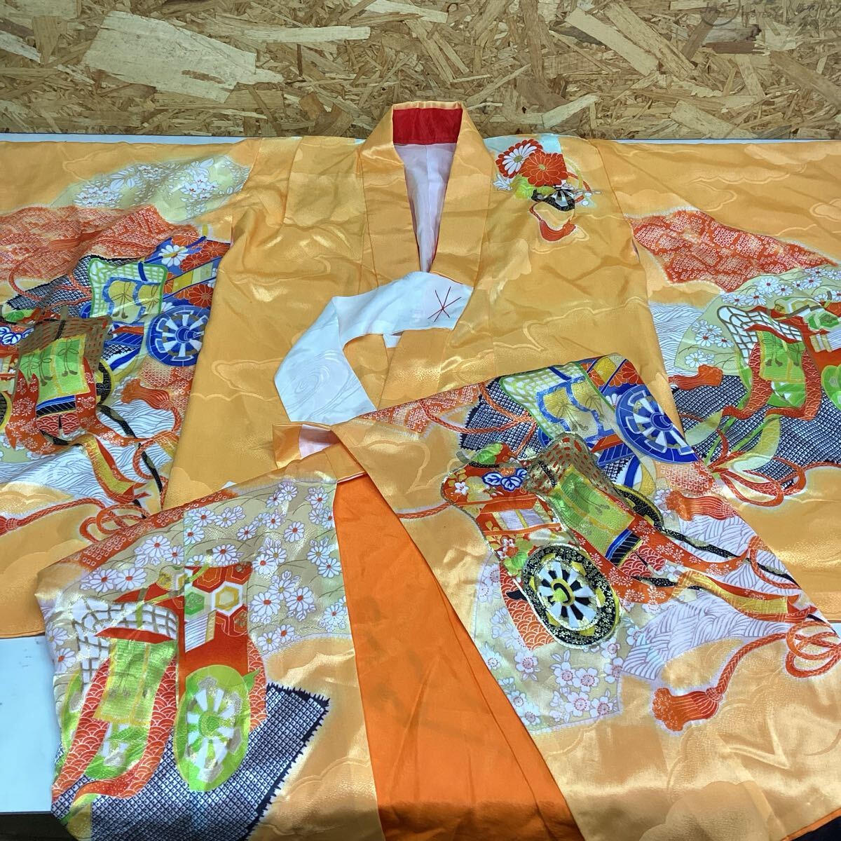 オレンジ色の伝統的な和柄の七五三衣装、華やか。