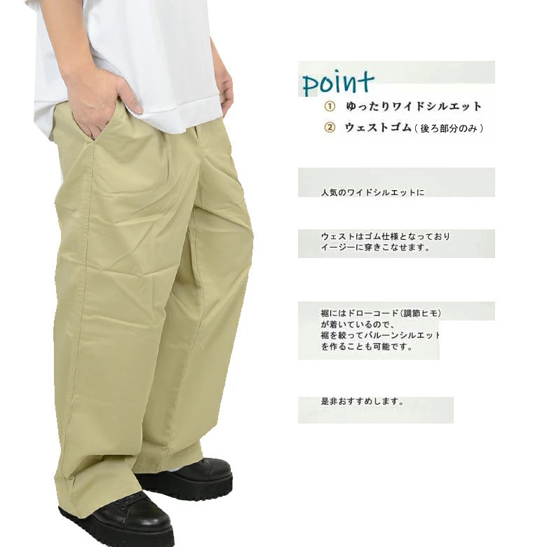バック部分のゴムウエストとドローコードがノンストレスなイージーワイドパンツ