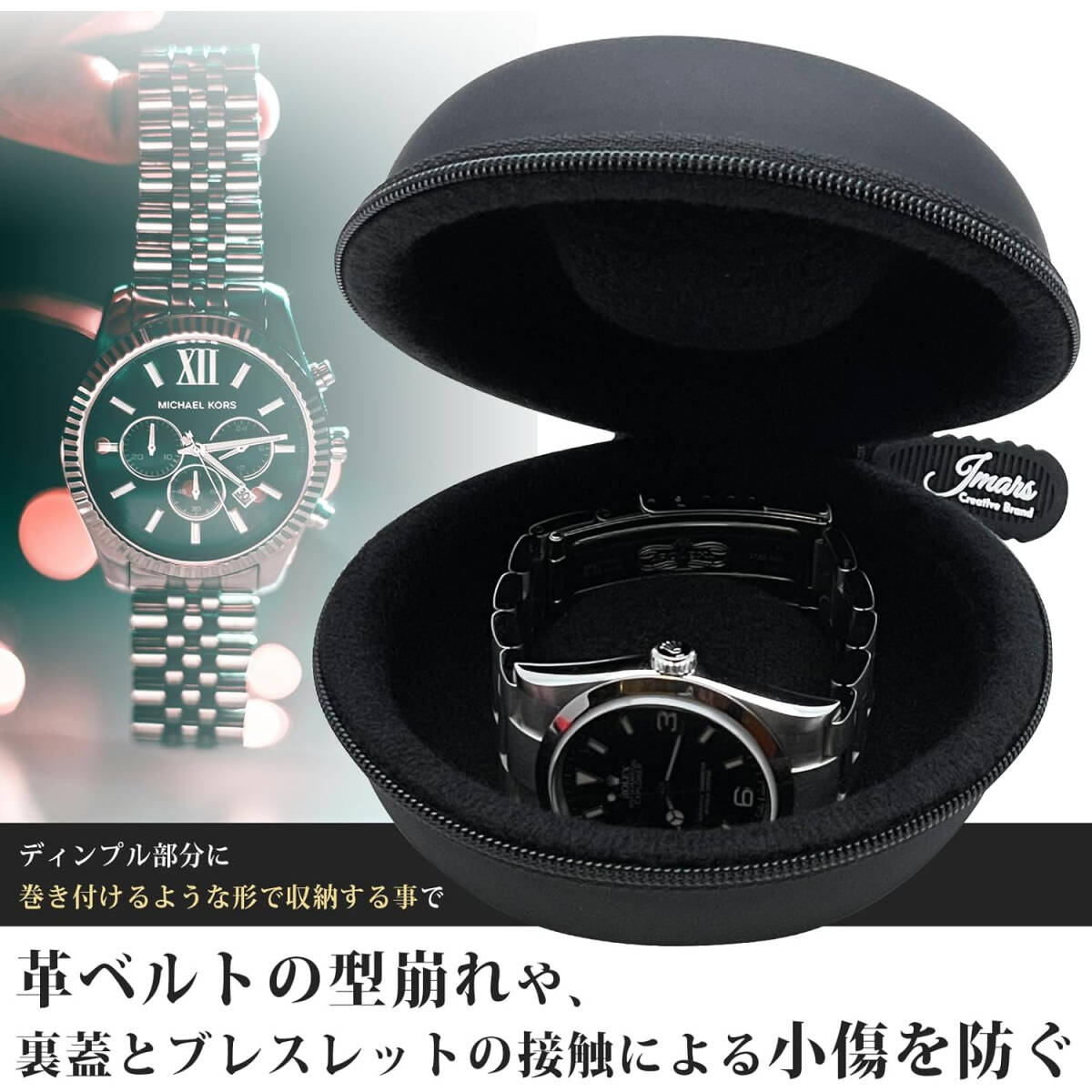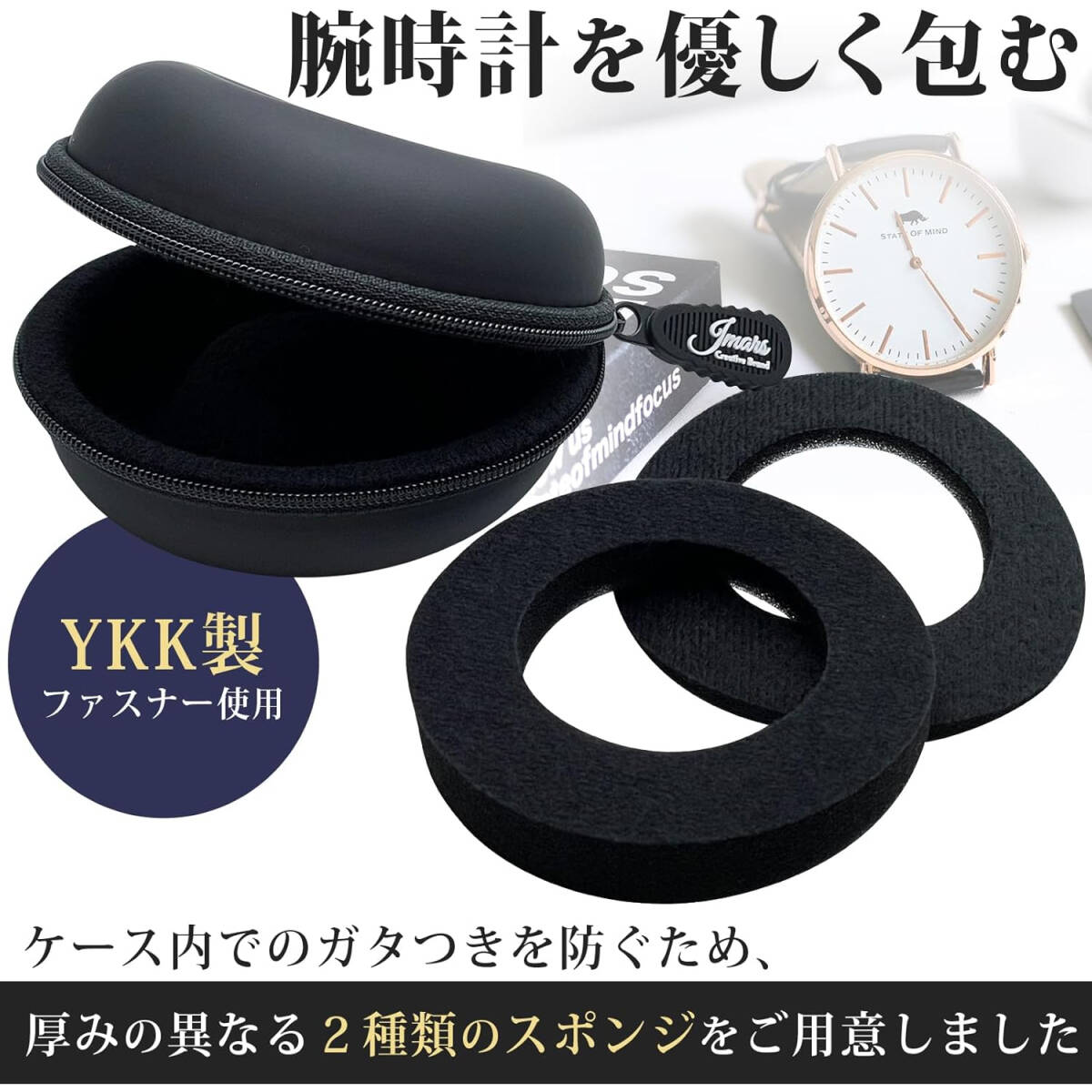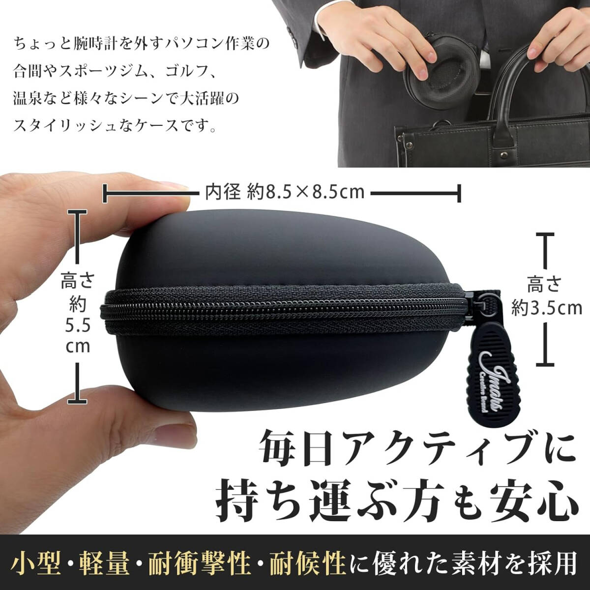 腕時計 携帯ケース レザーブラック ファスナー 軽量 丸型 時計を守るクッション付き 持ち運び カラビナ付 インナースポンジ 保管