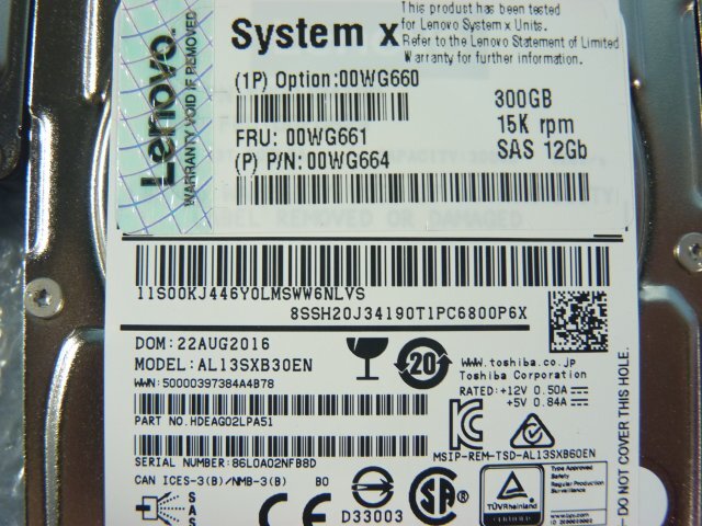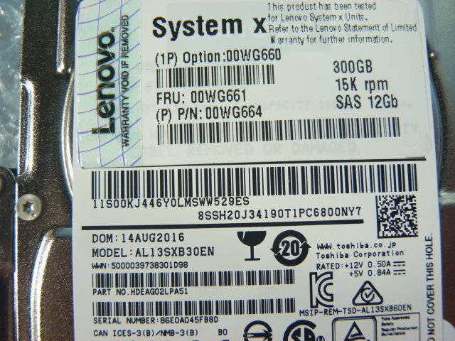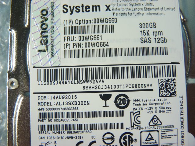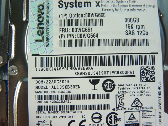 4個セット IBM 00WG661 300GB 2.5インチ SAS HDD 15Krpm 12Gb 15mm / AL13SXB30EN / 00WG660 00WG664