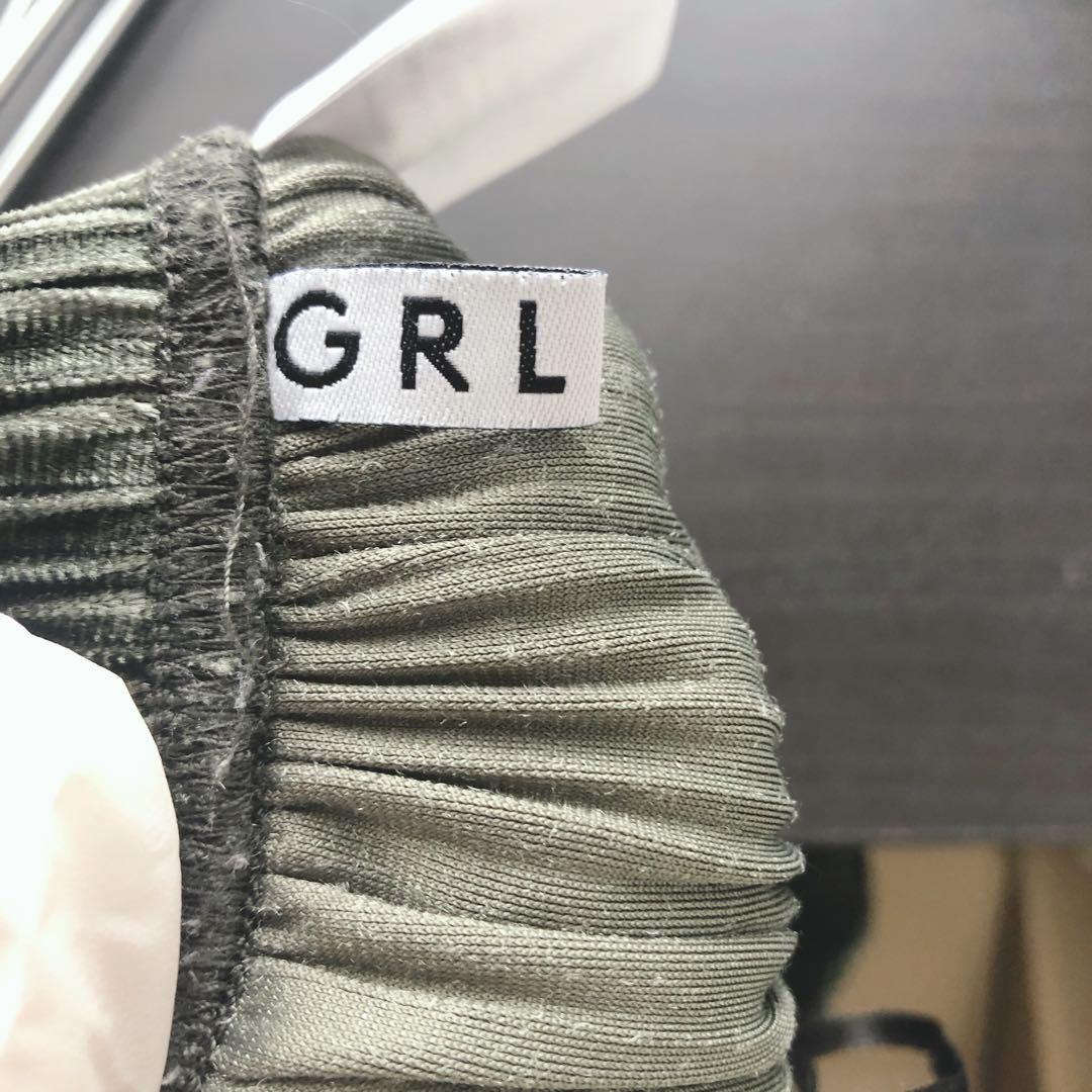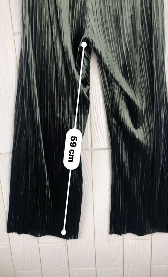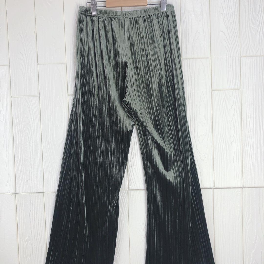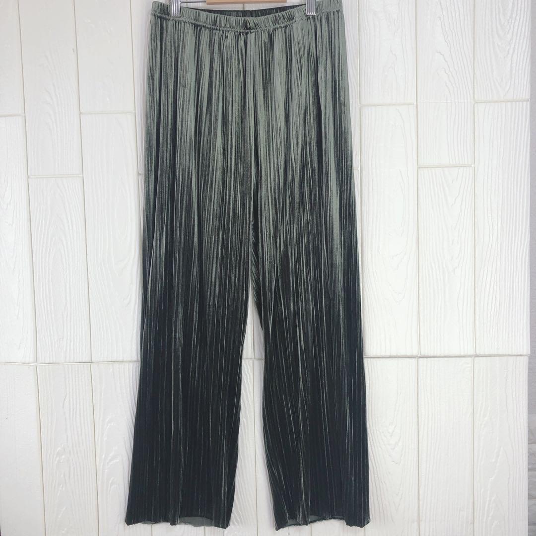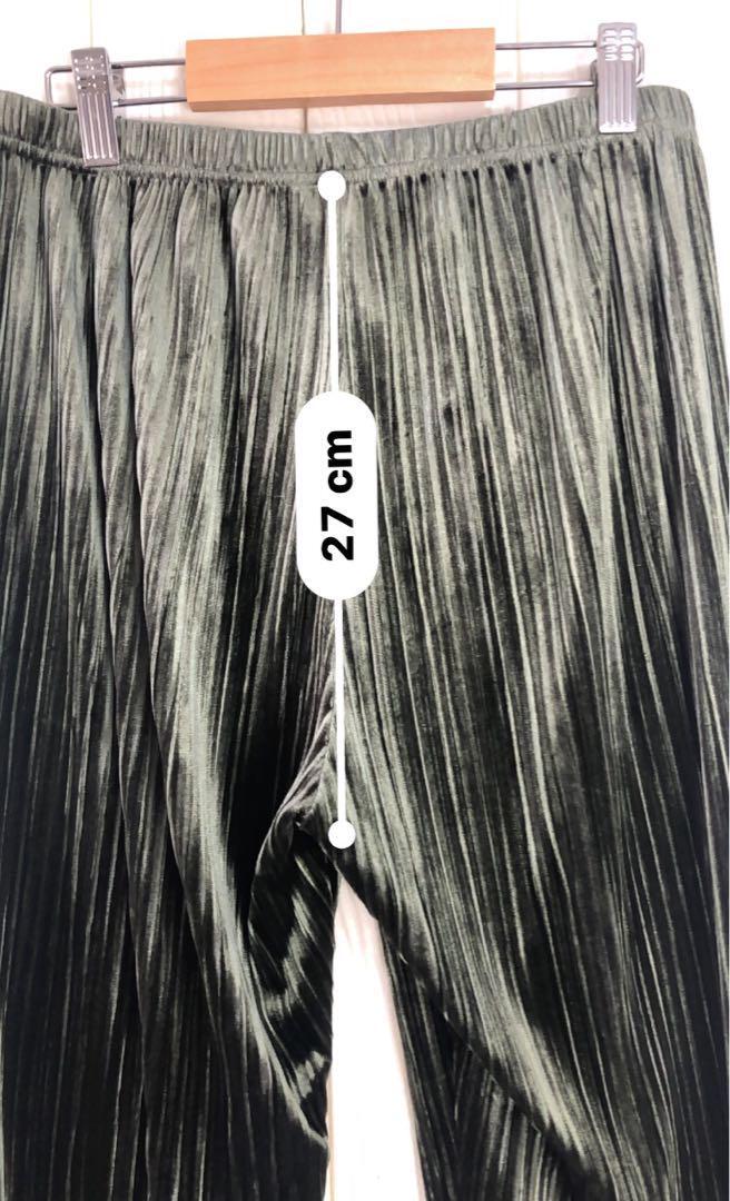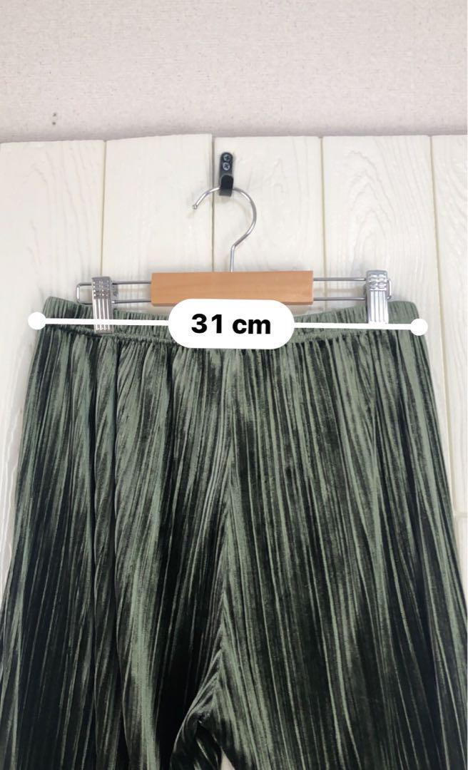 プリーツ加工のグリーンカジュアルパンツ、ウエスト31cm、股下27cm。