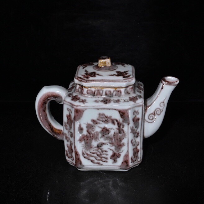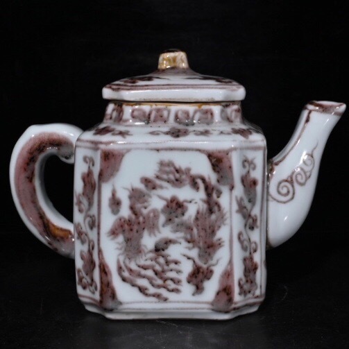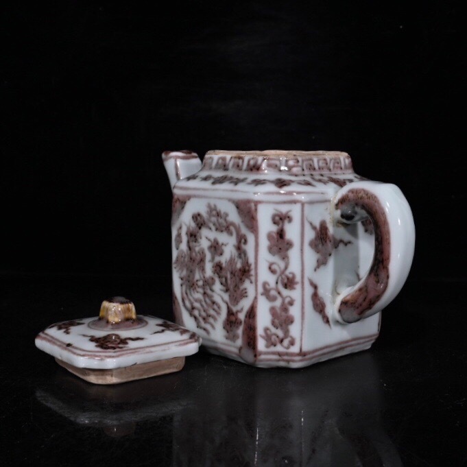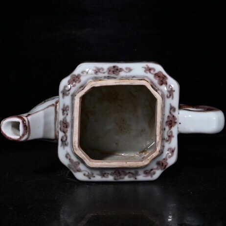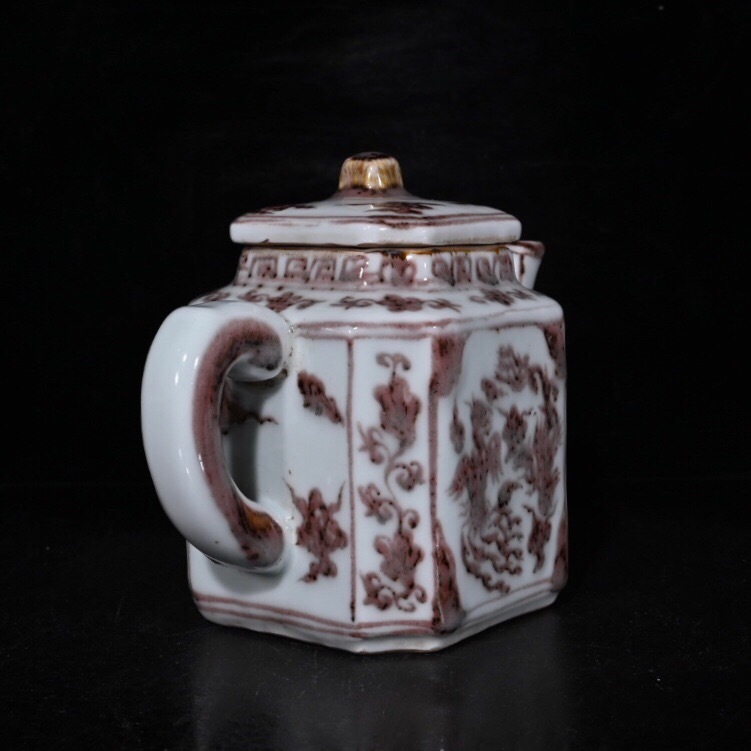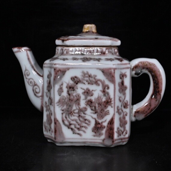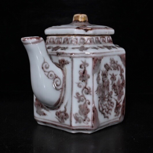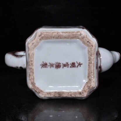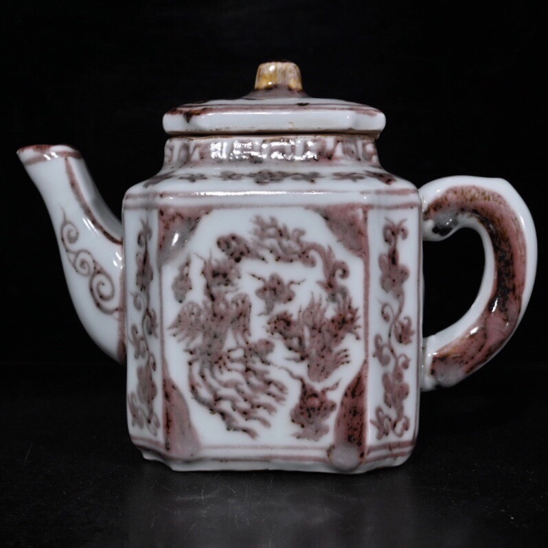 【超珍館蔵】明 宣德年製款 古陶瓷品 釉里紅 雙鳳紋 四方壺 置物 古賞物 古美術品 稀少珍蔵品