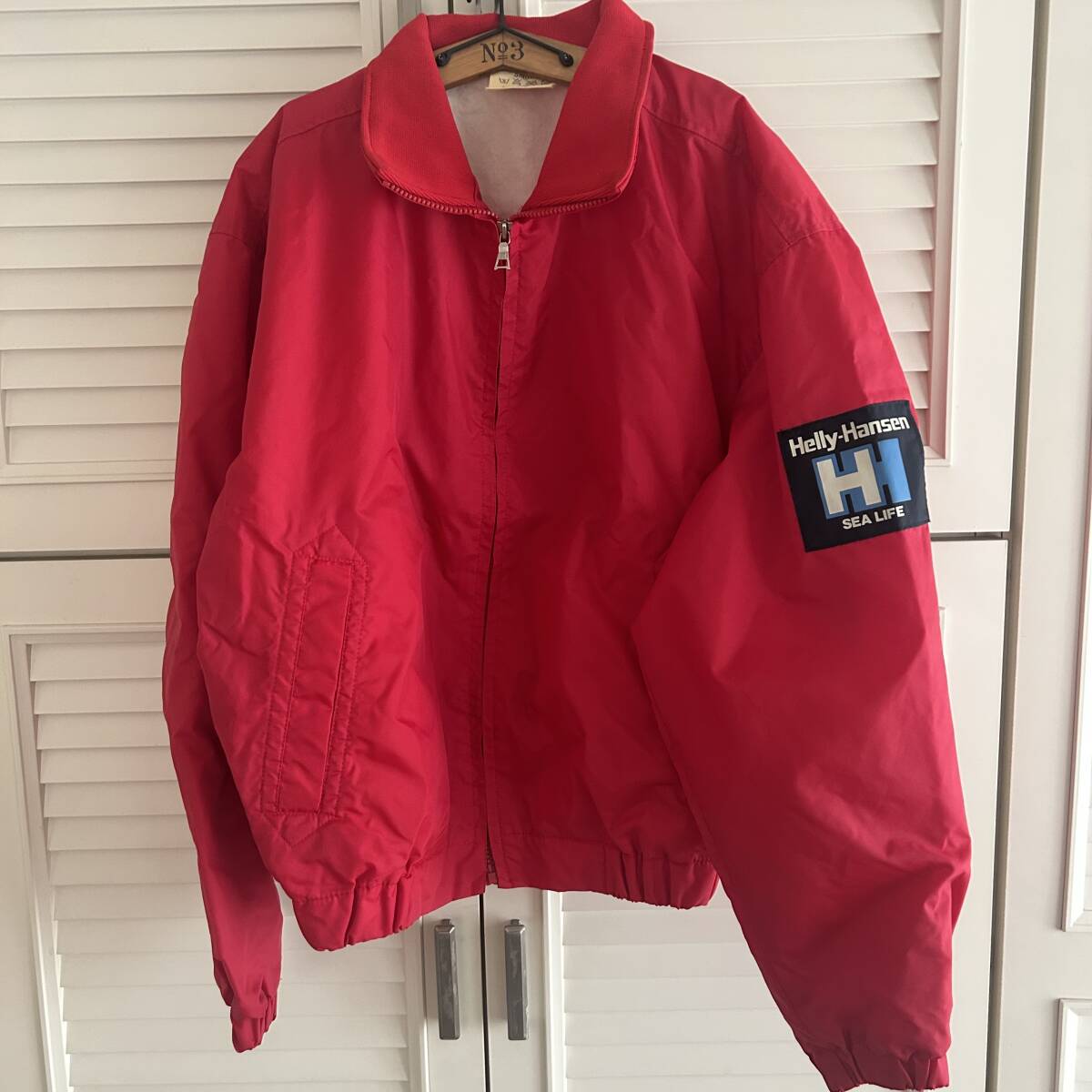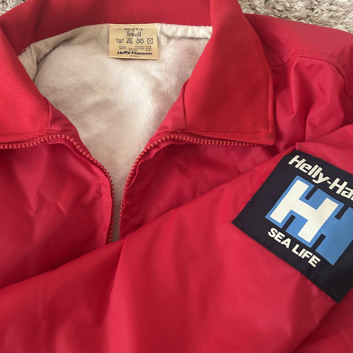鮮やかなレッドのHelly Hansenナイロンジャケット、SEA LIFEロゴ付き、サイズSmall。