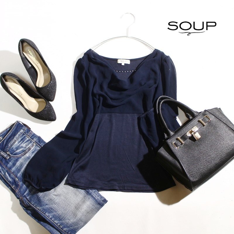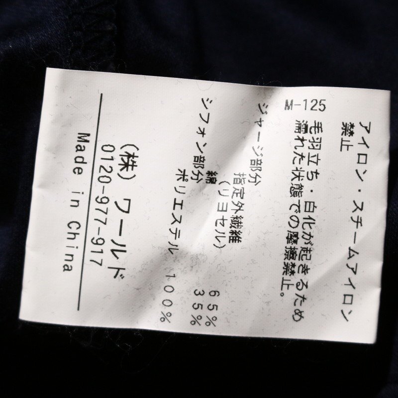 美品 スープ SOUP 株) ワールド 春 夏 フォーマルインナーに ビーズ 長袖 シフォン切替 カットソー ブラウス 9号 ネイビー 紺 綺麗め