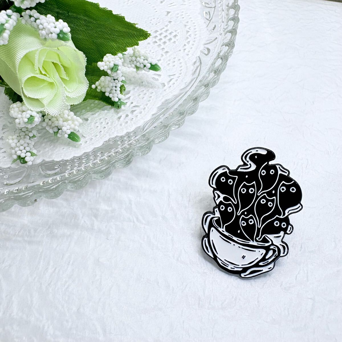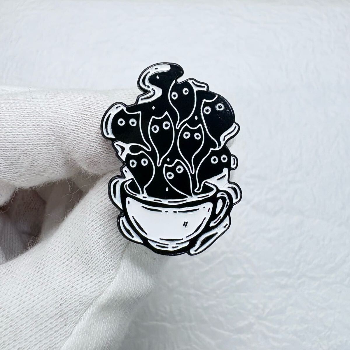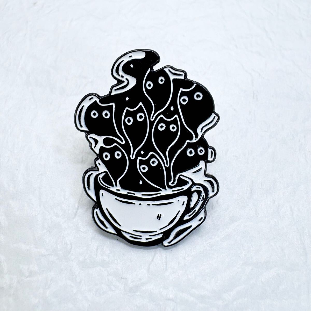 【ピンバッジ】猫のお化け カップ 煙 湯気 白黒 にゃんこ