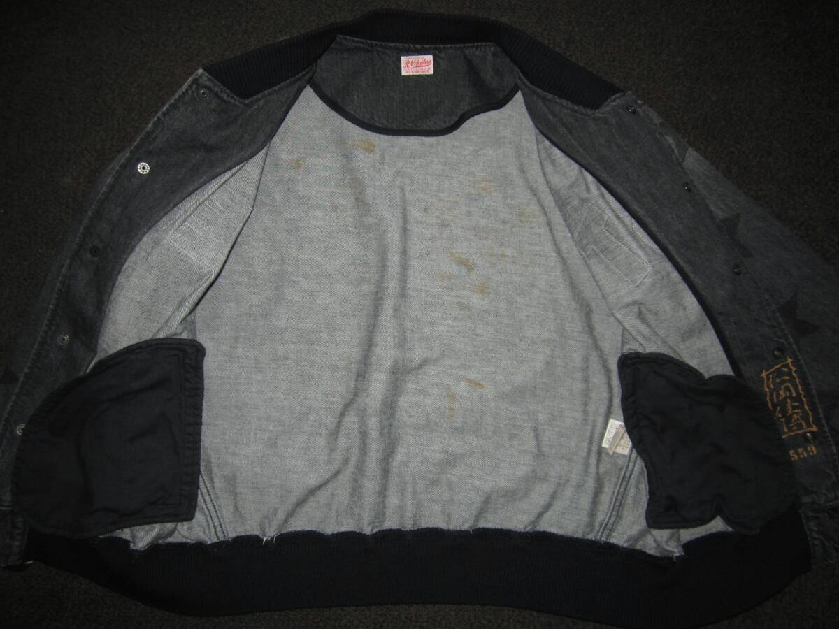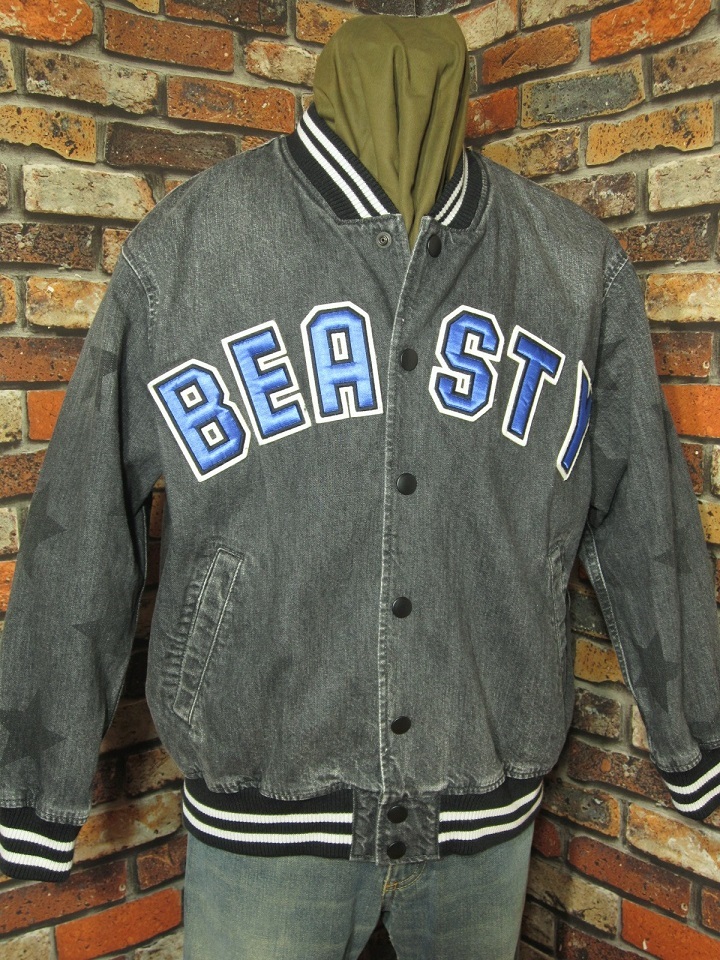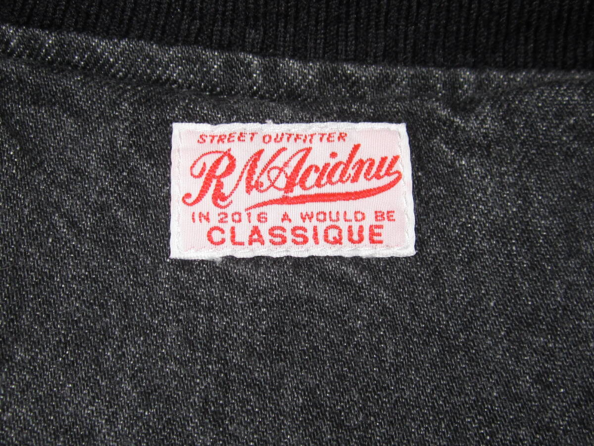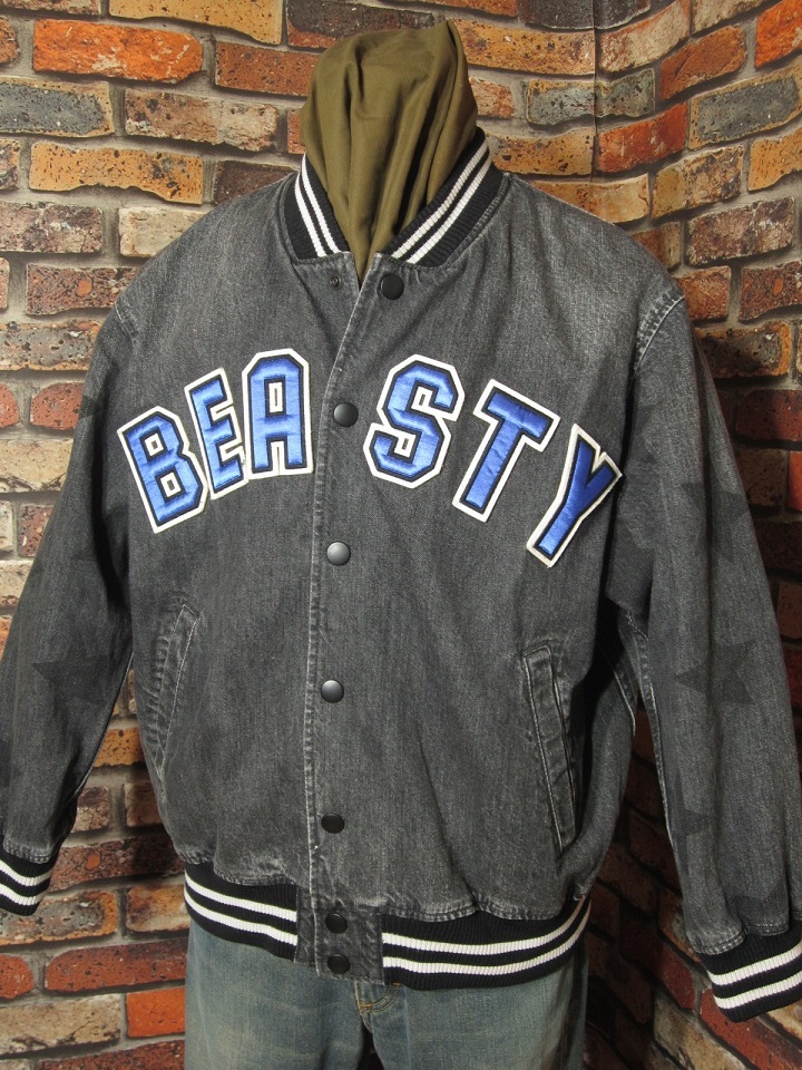 | RNA・レディース・デニムスタジャン 【サイズ】 レディースでサイズ表記は「M」になっていて身幅・肩幅が大きく横に広めな造りです。 ※実寸をご確認ください。 肩幅約49cm・身幅約57cm・ウエスト幅約45cm 袖丈約51cm・着丈約60cm (袖丈は袖先のリブの部分も含めて計測) (着丈は裾リブの部分のみ含めて計測) (ウエスト幅は腰のリブの付け根部分を計測) 【状態】 表地はコットン100%のデニムで、一枚生地ですので春や秋頃に適しているのではないでしょうか。 全体的に着用感はありますが破れや大きな汚れはありません。 色は色落ちしたブラックで、袖に星型のマークが入っています。 (スマホやPC環境により色は違いが出る事があります) 背中の裏側にペイント液が滲んでいますので予めご了承ください。 リブは若干毛羽立ちはありますが全体的に着用感少なく穴等もありません。 フロントはパチッと留めるホック式ボタンで全て付いています。 フロントの「BEASTY」の文字は元々から付いていたワッペンで、背中のイラストは私が描いたものになります。 | |