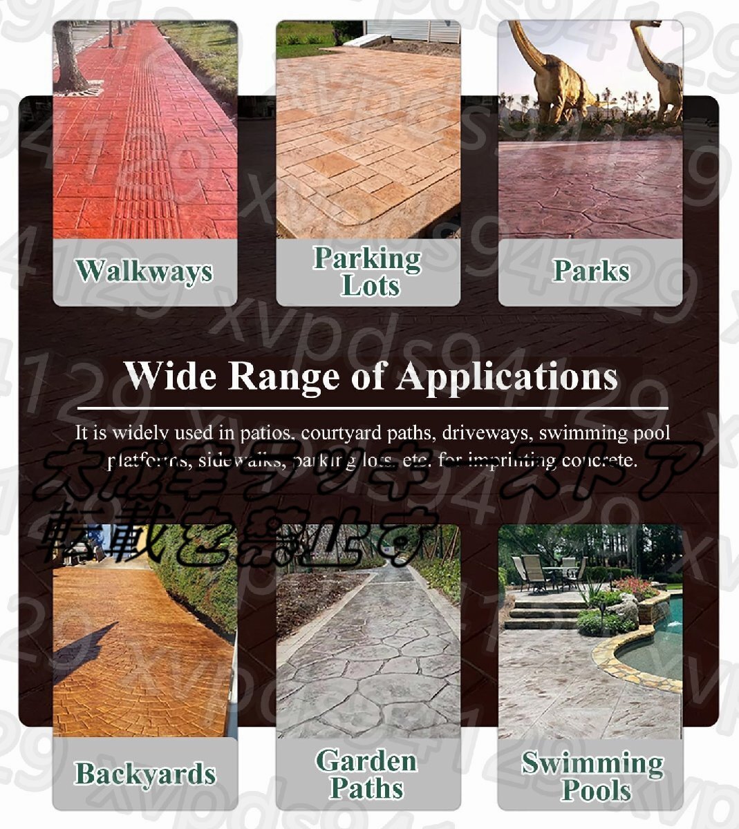 ?? 【 広く使われている 】 広場、庭の小道、ホテルのロビー、中庭、パティオ、歩道、車道、駐車場、ガレージ、プールのプラットフォーム、壁などに広く使用されています。当社の柔軟なポリウレタンスタンプパッドを使用すると、垂直および水平面に高品質の印刷を行うことができます。 コンクリート、石膏、セメント石膏、接着剤、パテ!