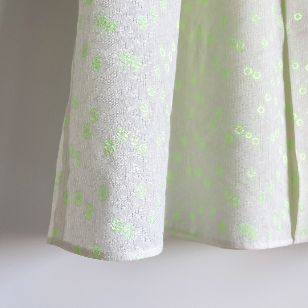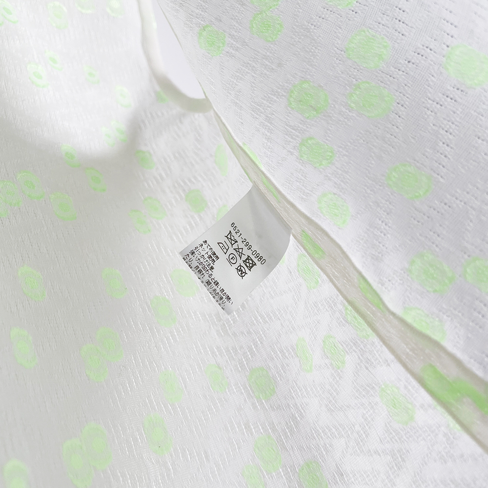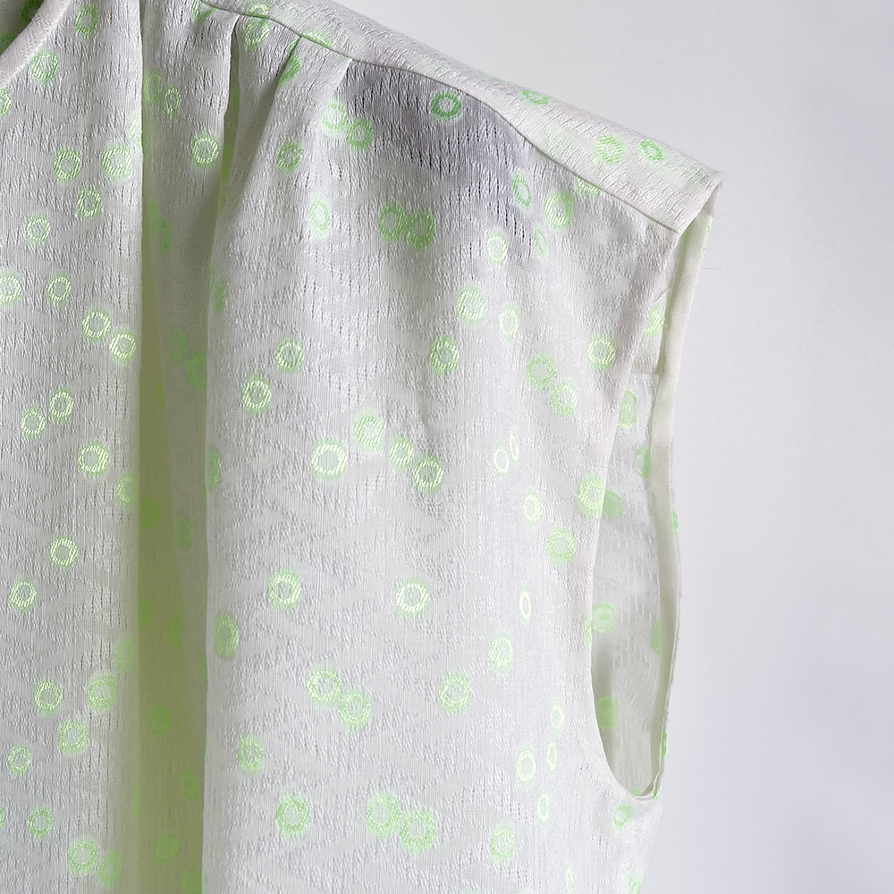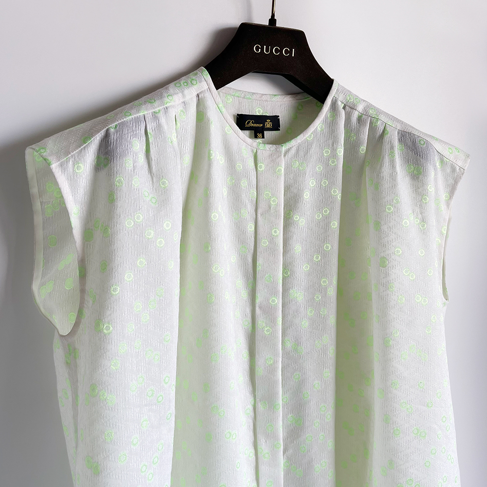 Drawer 22SS ドットジャガード シアーブラウスです。 ネオンカラーのドットジャガード素材が特徴的なノースリーブブラウス。 雰囲気のあるオーバーサイズ・ボックスシルエットで個性を引き立てます。 ■デザイン ヨーク下からギャザーを入れたふわりとしたボックスシルエットが特徴。 アームカバーするノースリーブデザインがポイントです。 ■素材 ジグザグの透かし織りにネオンカラーのドットのジャカードが施された素材。 質感のある手触りとシアーな風合いが特徴。 ノースリーブの記載ございますが、実際に着用しますとフレンチスリーブのような袖丈です。 明るいライトグリーンで、爽やかな華やかさです。 日本製 ●サイズ:36 ●実寸:肩幅51cm、身幅 約63cm、着丈後67cm (平置きに採寸。多少の誤差はご容赦ください。) ●カラー:ライトグリーン ●素材:リネン53%、ナイロン21%、コットン17%、アセテート9% ●定価:85,800円 ●状態:一回短時間着用、新品同様の美品です。 汚れや難などはございません。 | |||