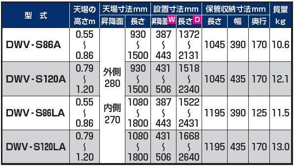 | 天場スライドタイプ:DWV-S120LA 天場寸法:長さ1080~1800mm |