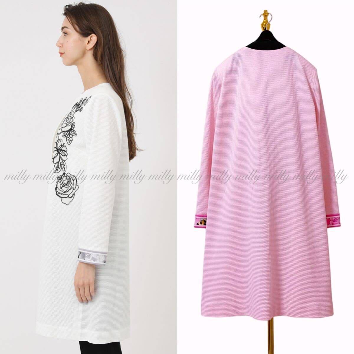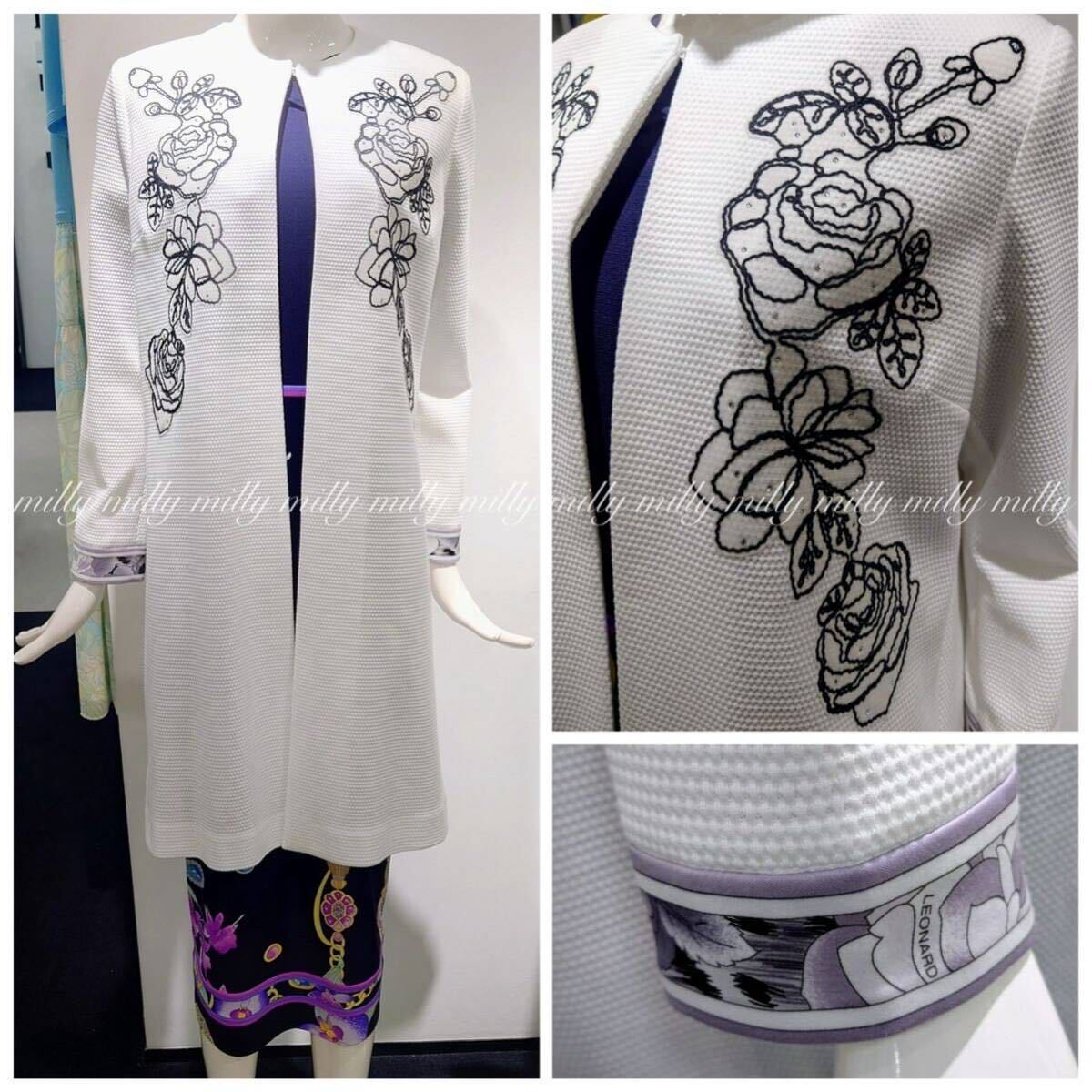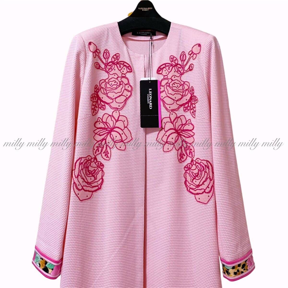 コットンニットの爽やかなメッシュ編みが風合いあるデザインジャケット。前身に施した線タッチの刺繍モチーフがお洒落度の高いエレガントなお作りです。ノーカラーのシンプルなフォルムで丈感長めの着映えするシルエット。袖口のLEONARDらしいライン使いやさりげなく光るラインストーンもポイントです。ひとつ留めフックで着脱しやすく、様々なシーンで活躍してくれるアイテムです。