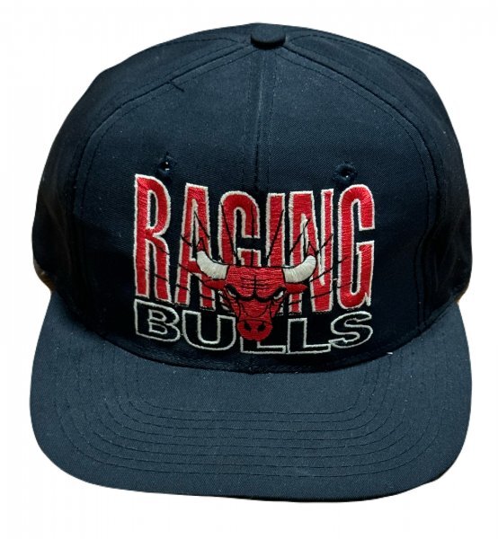 ビンテージ 90s Chicago Bulls シカゴ ブルズ Raging Bulls ロゴ 刺繍 6パネル キャップ 帽子です。