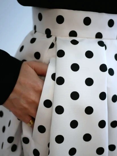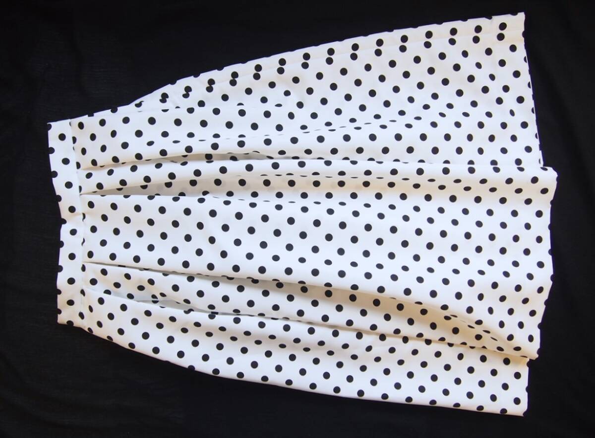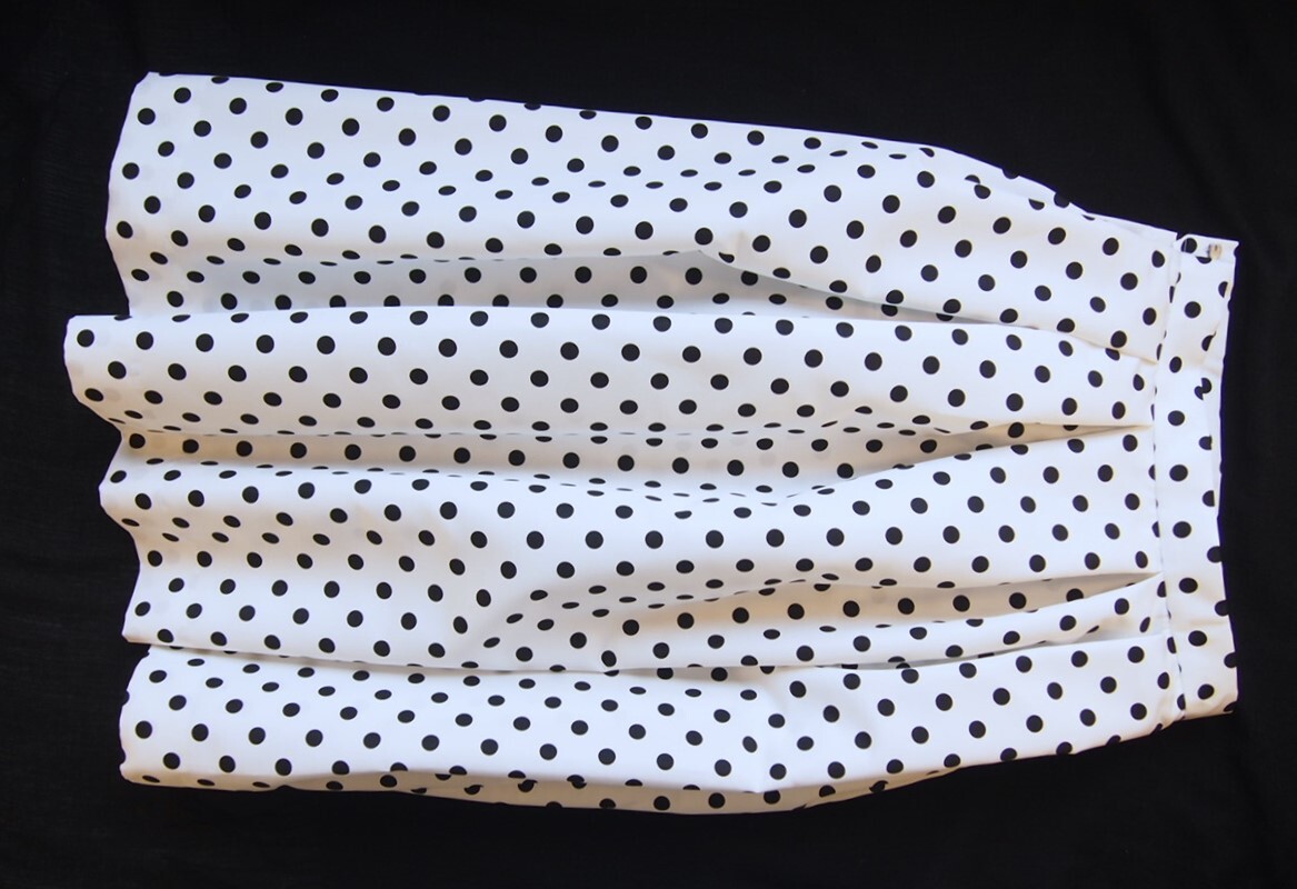 お色はホワイト×黒の水玉ドットです。ドットも小さすぎると無地っぽくなってしまいますが、こちらは小さすぎず大きすぎないのドットがとても爽やか。見ているだけで笑顔になるようなスカートです。 軽くハリのある質感です。裏地なしの一枚仕立て。軽く履きやすく扱いやすいかと思います。