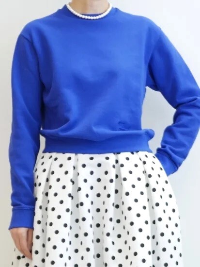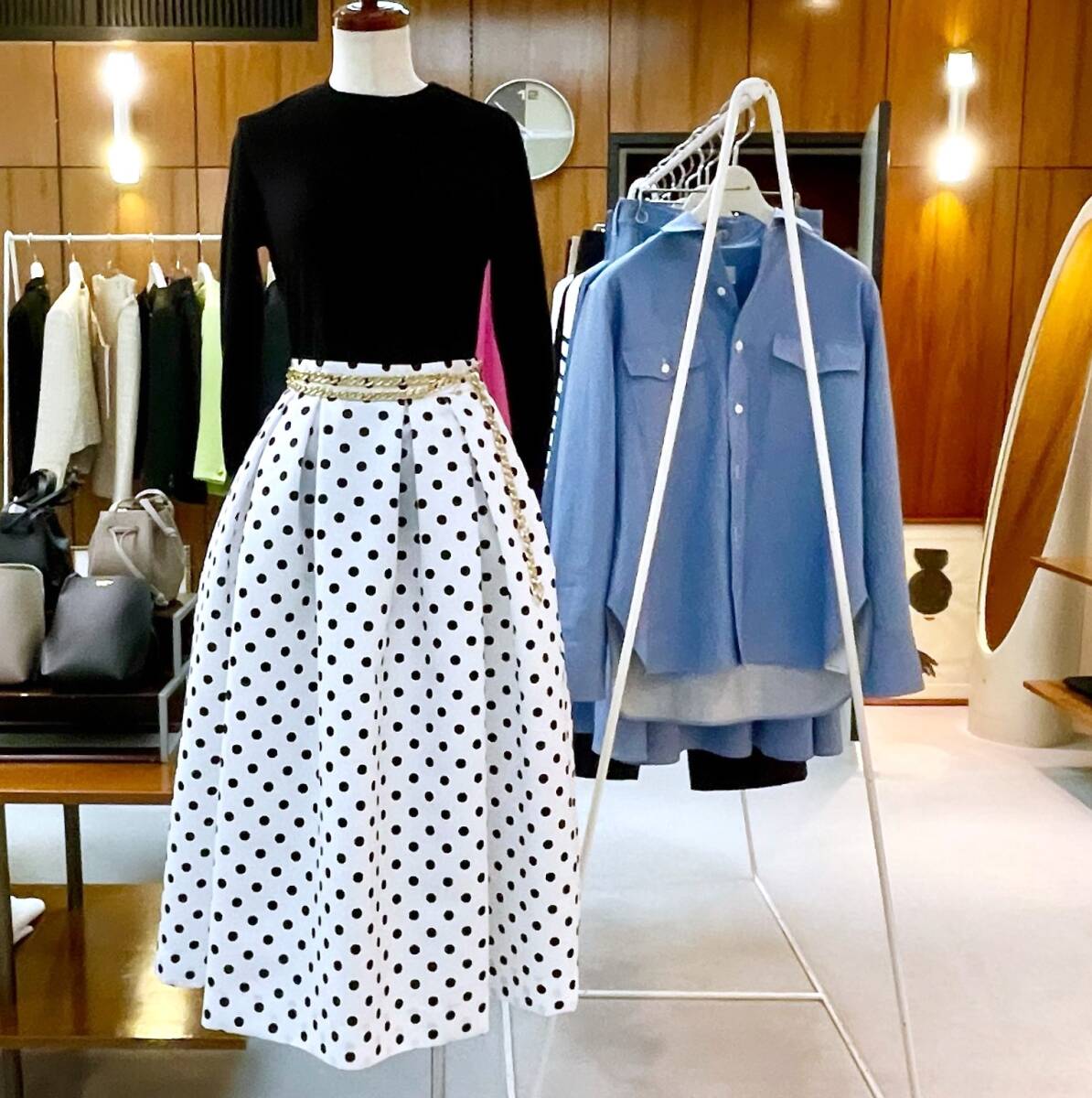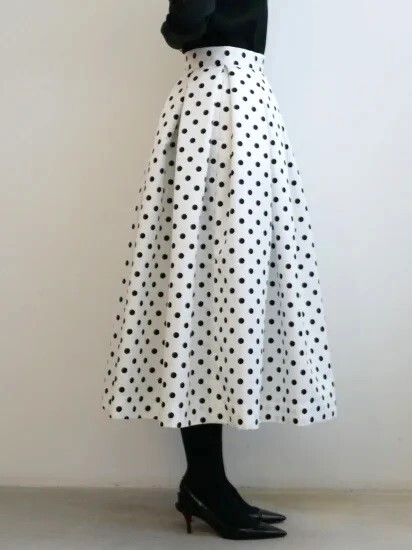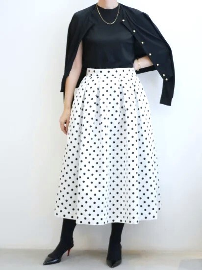 張りがあり膝下丈。体の線を出さずスタイルが良く見えます。 トップスは黒やネイビーなどのダークカラーはじめ、パステルとの相性抜群なのが白地に黒のドットです。お手持ちのカラフルなカーディガンなどあわせなとも素敵かと思います。