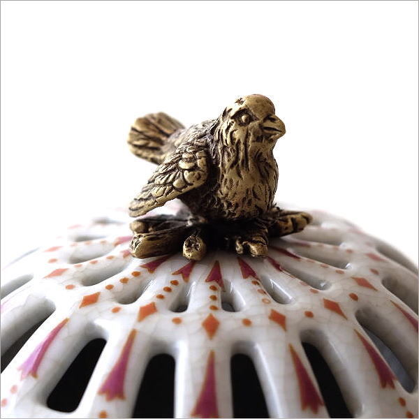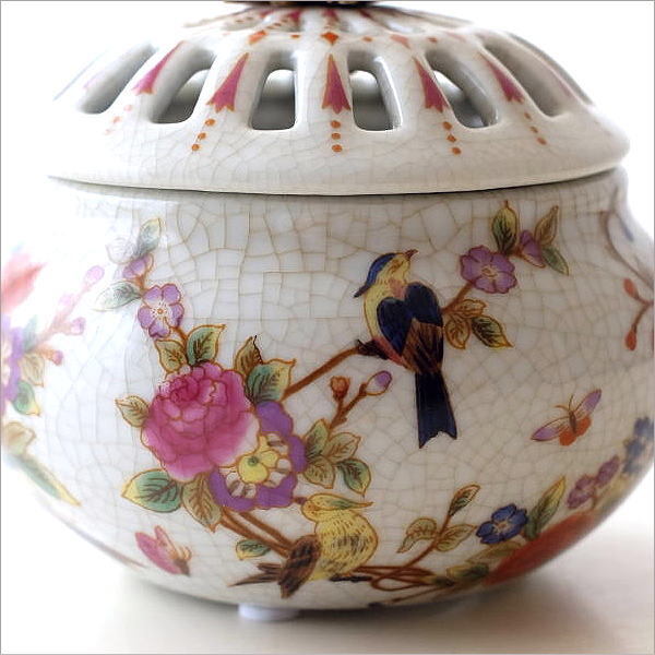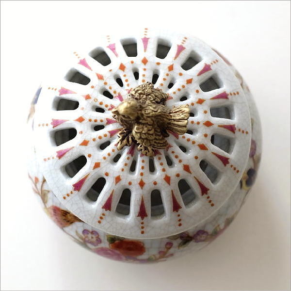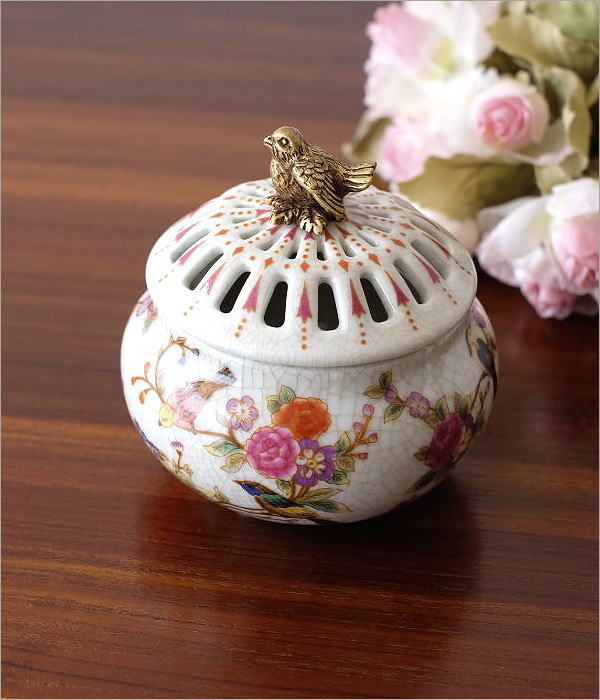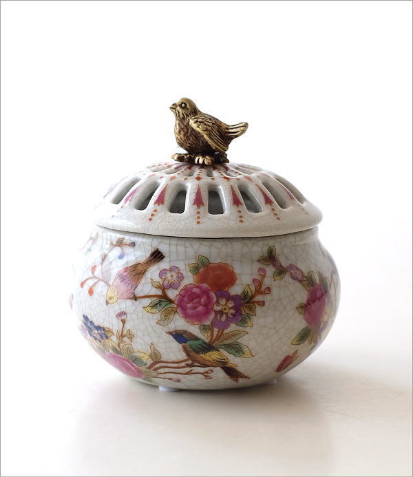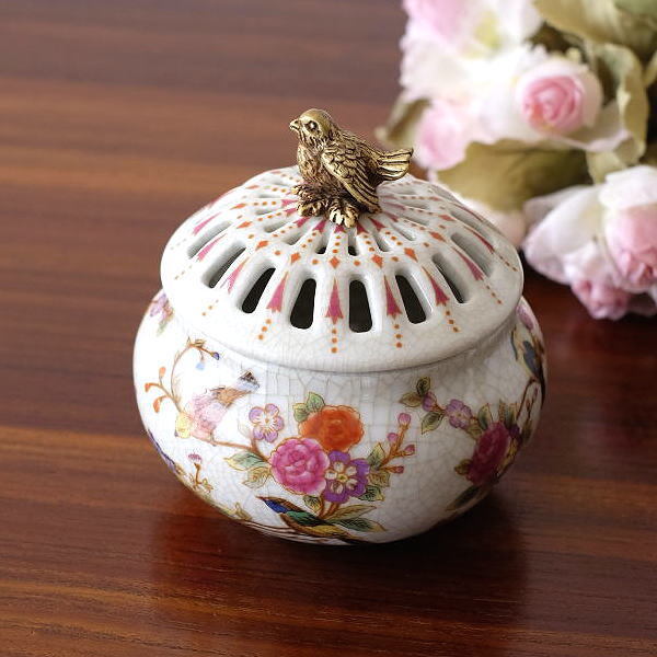| 陶器の本体の縁回りや脚部に 真鍮をあしらった アンティーク陶磁器の様な 高級感がたっぷりのアイテム シノワズリの上品な存在感が インテリアを華やかに彩ります 貫入の入った陶器に 職人の手仕事による 草花の絵付けが美しい蓋付きボックス 透かしをつけた蓋と 持ち手のバードの真鍮飾りが アクセントになっています お香を炊く香炉にも使えそうです 商品名 : シノワズリ 陶器の蓋付きラウンドボックス バード 商品番号 : ebn9304 全体サイズ(cm) : 幅10×奥行10×高さ10 材質 : 陶器 真鍮 重量 : 367g 生産国 : 中国 ※真鍮の特徴として、使い込むうちに酸化し色の変化が見られますが風合いとしてお楽しみください。 また、お届け時にすでに酸化の見られる商品もございます。商品の特徴と理解頂き、ご購入・ご使用をお願いします ※商品の特性上、本体の小傷や模様の個体差は商品の味となっています。予めご了承下さい ※僅かなガタつきはご容赦ください ※ディスプレイによる色の違いはご了承下さい |