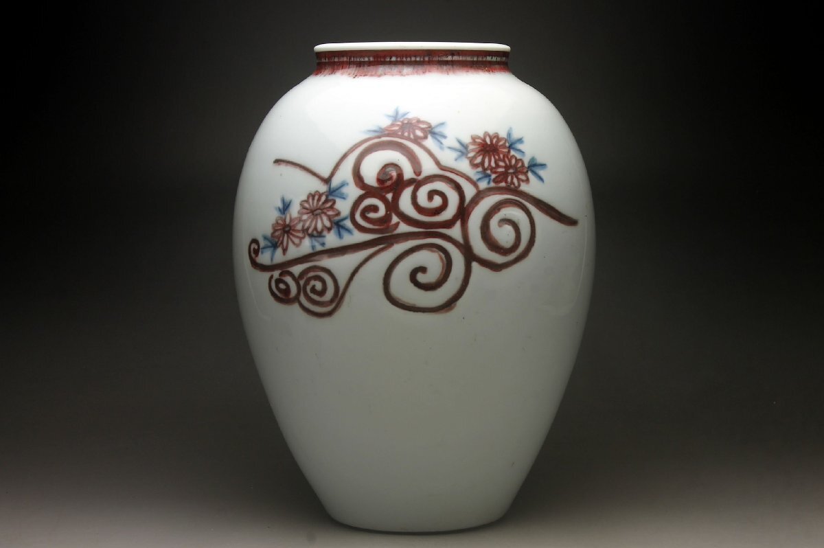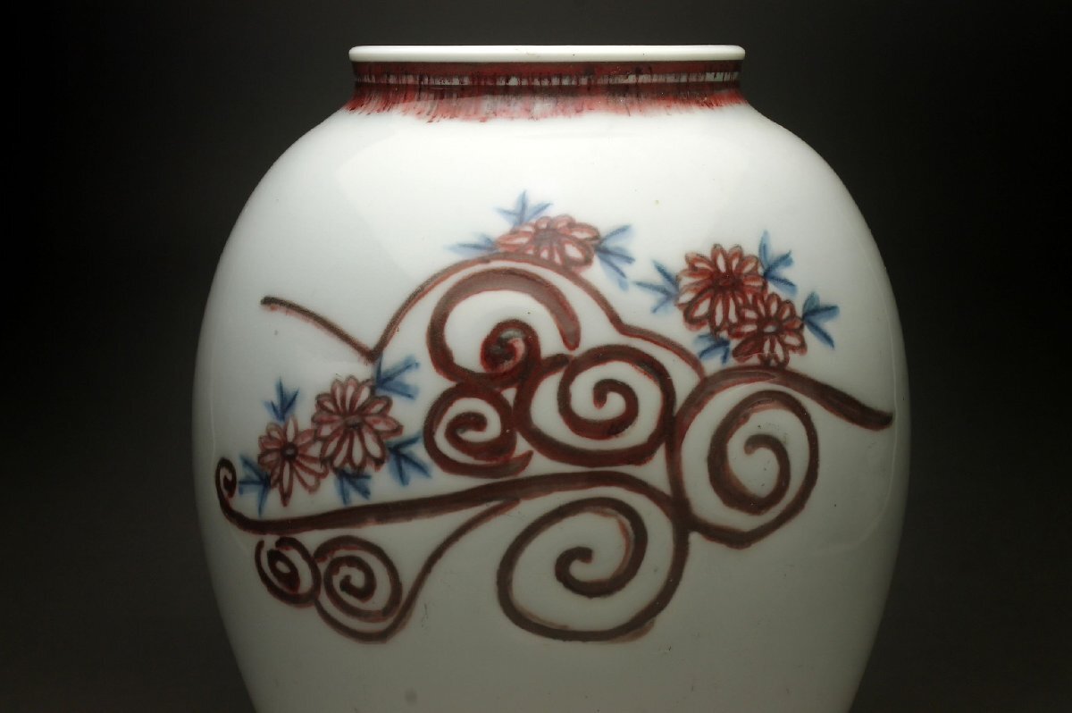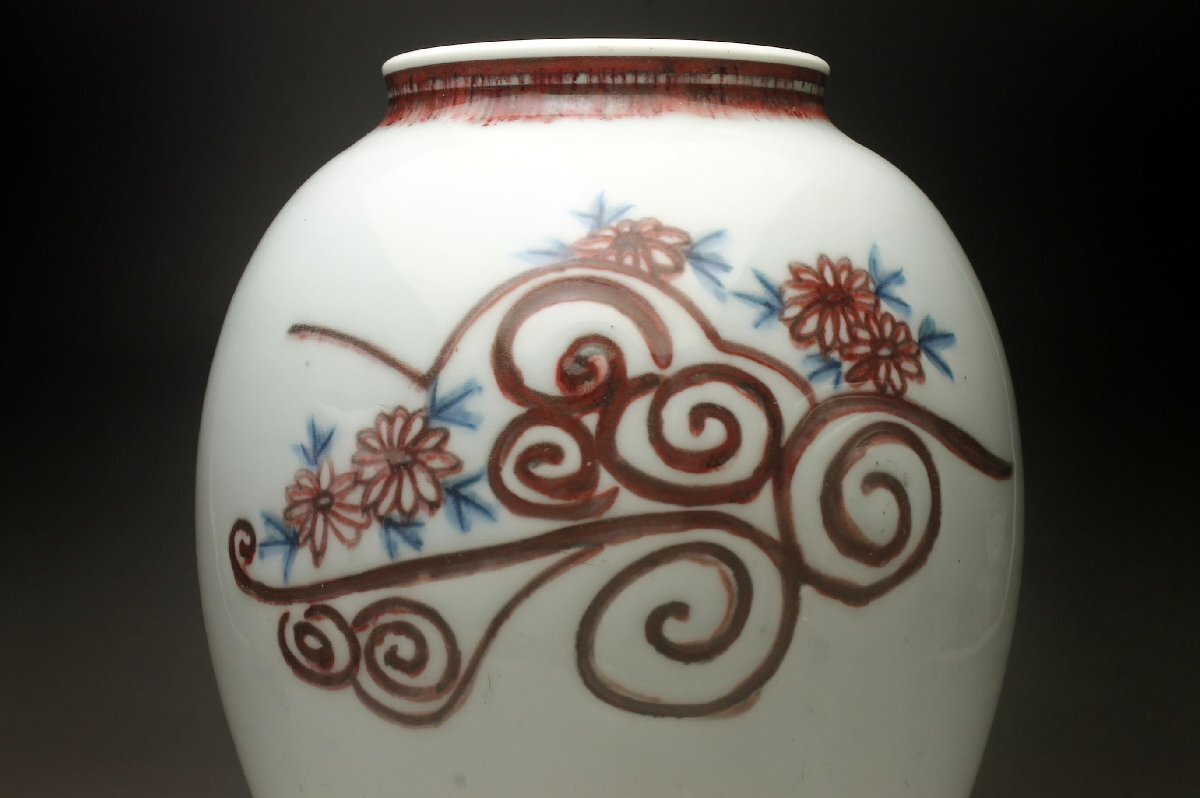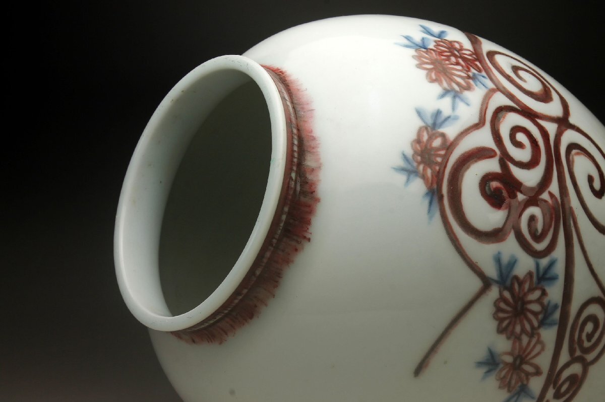 【余韻】 京焼 金峰作 釉里紅 菊文 花瓶★高さ:25.5cm 華道具 無傷美品<同梱可>
