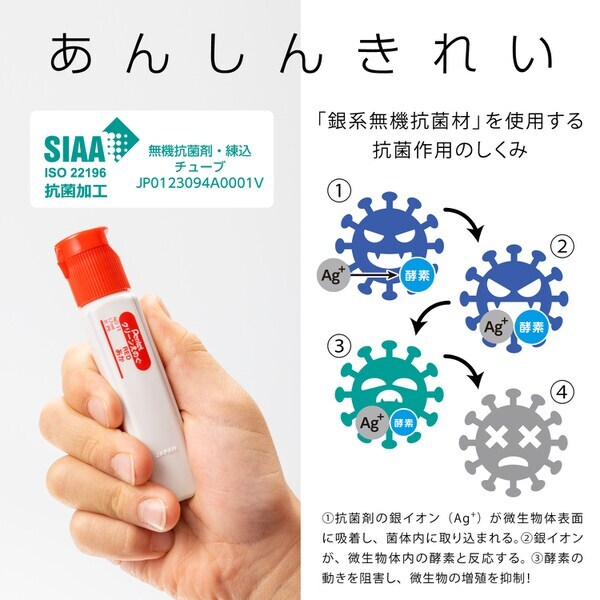 ・えのぐのチューブに銀系無機抗菌剤を使用しているので、チューブについた菌の増殖を抑制することができます。抗菌製品技術協会が制定した抗菌のシンボルマークであるSIAA抗菌マーク認証を取得しており、抗菌機能と安全性基準をクリアした製品とされています。
