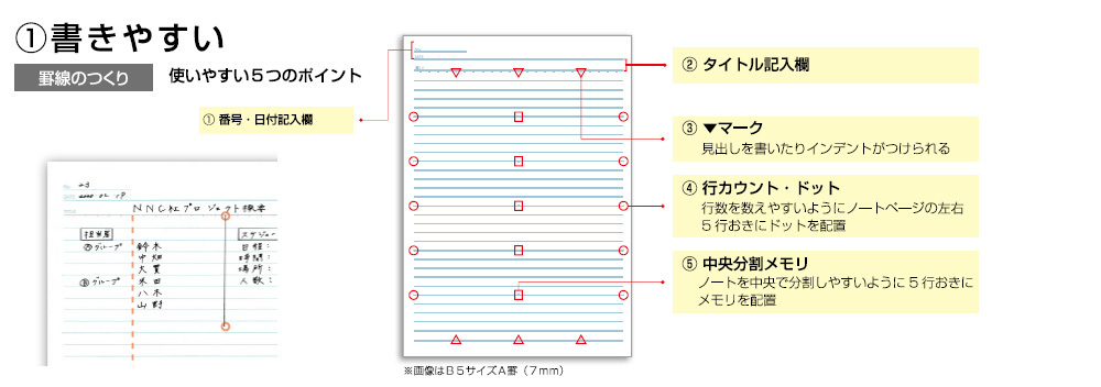 ・ノート中央で分割しやすいように5行おきにメモリを配置。