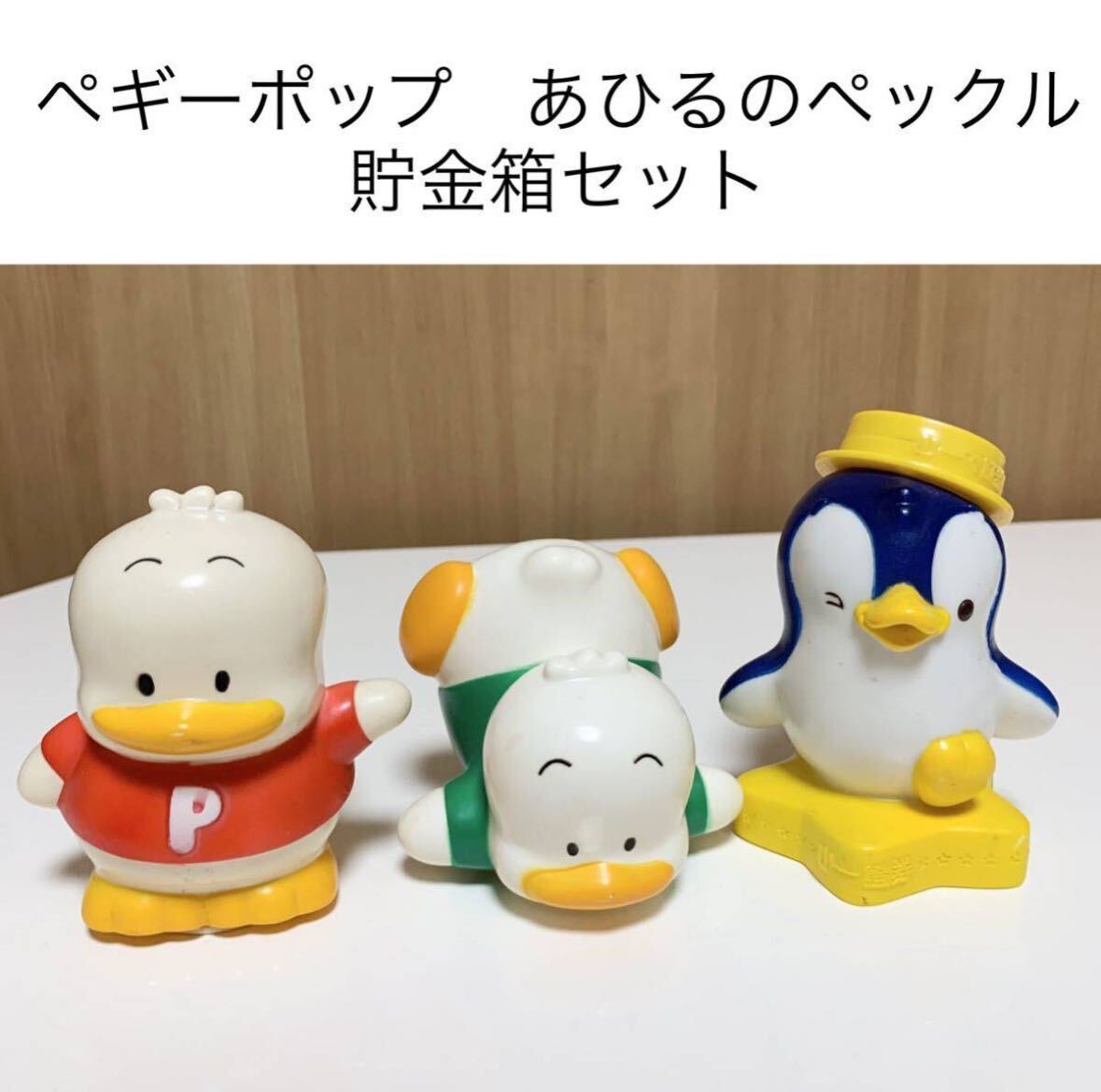富士銀行、山一證券とサンリオコラボのノベルティ貯金箱、あひるのペックルとサンリオデザイン山一證券マスコットキャラクター・ペンギンのペギーポップの3種類3点セット。
