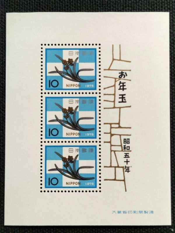 [23112424] 年賀切手【お年玉小型シート 昭和50年】「桂離宮水仙の釘隠し」10円×3 1975年発行 美品*