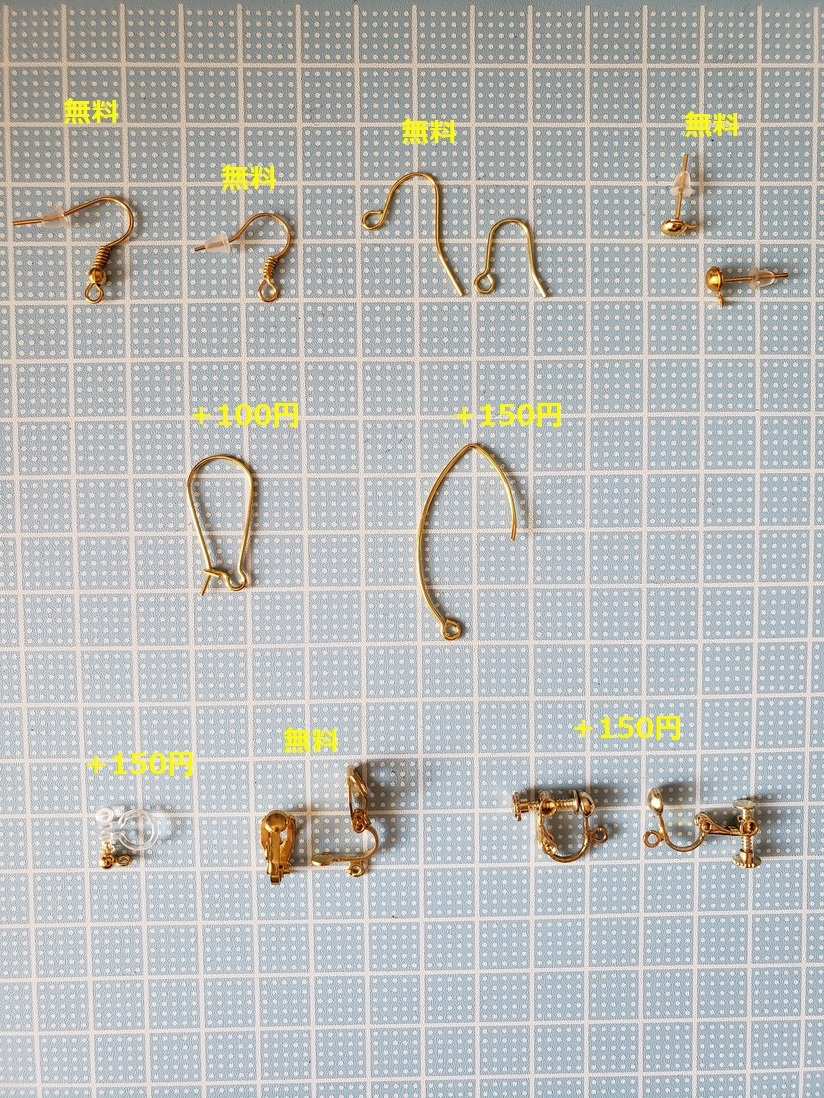 5枚目画像の下段左より、樹脂ノンホールピアスで+150円、バネ(クリップ)式イヤリング金具は無料、ネジバネ式イヤリング金具で+150円