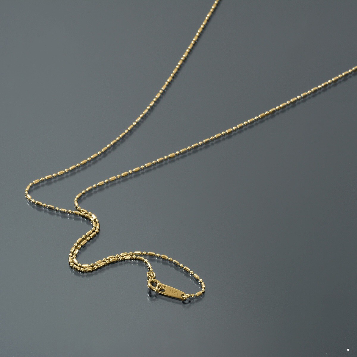 変形カットボールチェーンは俵型のバーとボールが交互に連なった変形ボールチェーンにカットを入れたネックレスです。棒と球のパーツが連なるので(BAR×ROUND)、BRチェーンと商品名に付いております。 ※こちらのチェーンは絡まりにくく万が一絡まってしまったとしても解きやすいデザインです。 ※イオンプレーティング(IPメッキ)とは、金属イオンと不活性ガスを反応させた化合物を製品に蒸着させるコーティングで、ガスの比率でカラーを調整します。従来の鍍金加工に比べて表面耐久性、密着性、工程の安全性が飛躍的に向上しております。 |