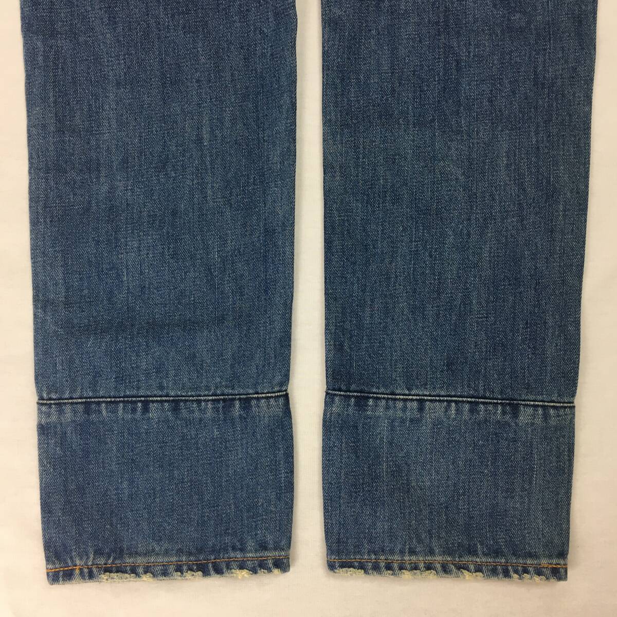 ポケット入口、両裾、アーキュエイトステッチの擦れ、裾から12cm辺りで一度切り離されているのも加工によるものです。