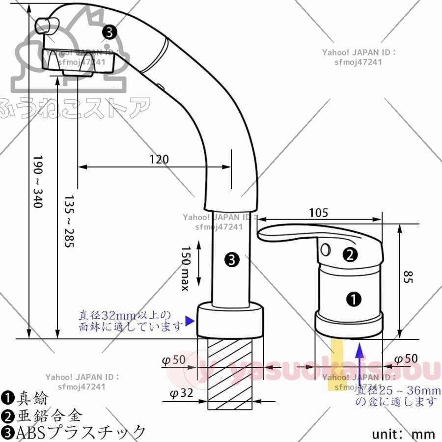 ■【2穴に取付可能】蛇口ノズルはφ32以上の面鉢に適用。コントロールレバーはφ25-25mmの取り付け穴に対応。取り付け芯ピッチ:100-105mm,取り付けホース付き:G1/2規格、2本(50cm),簡単に取り付け可能。