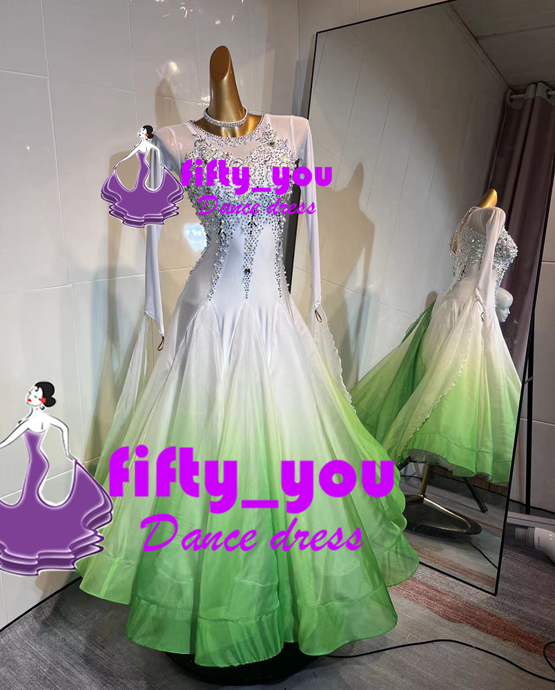 新品fifty_you セミオーダードレス  社交ダンス衣装  高級品 モダン競技試合ドレス スタンダードドレス グラデーション色 白+緑