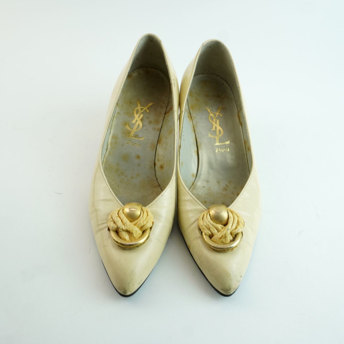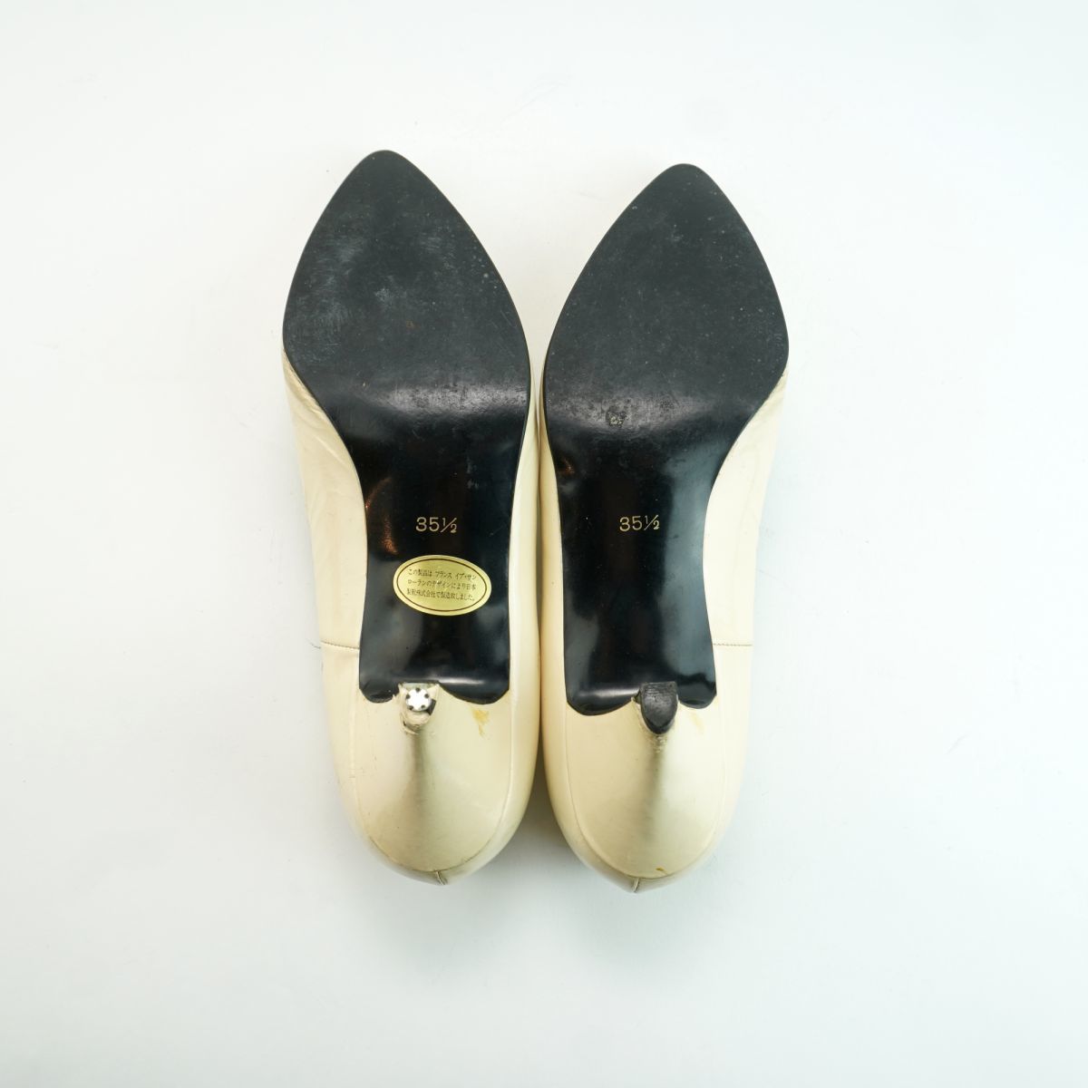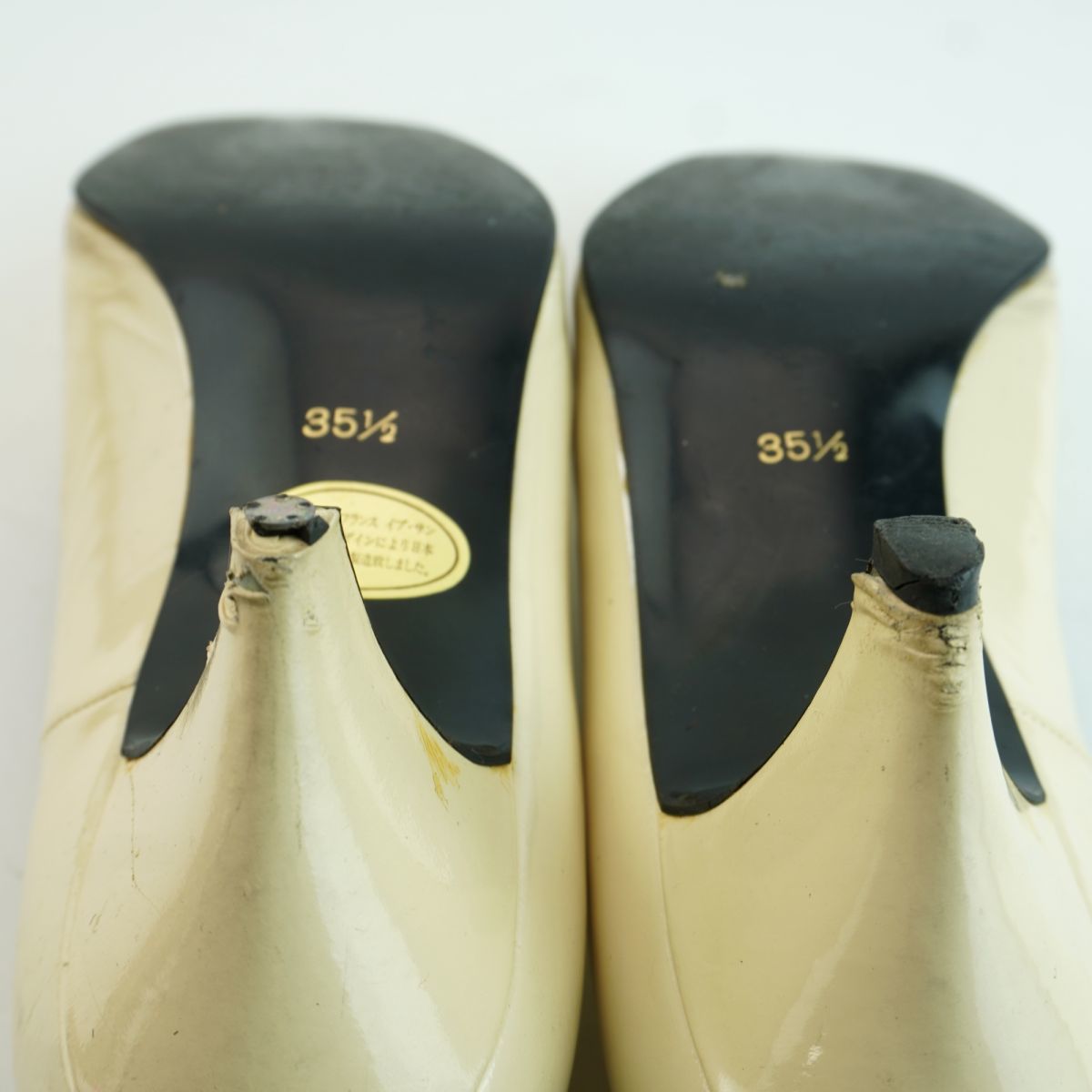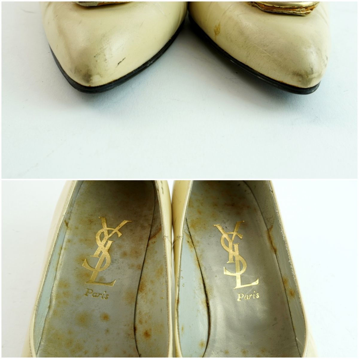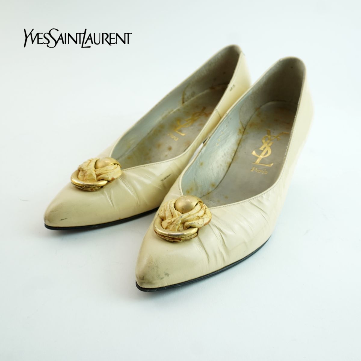 Yves Saint Laurent イヴ・サンローラン 35 1/2 22.5 パンプス ヒール アーモンドトゥ ゴールド金具 エナメル アイボリー/MC48