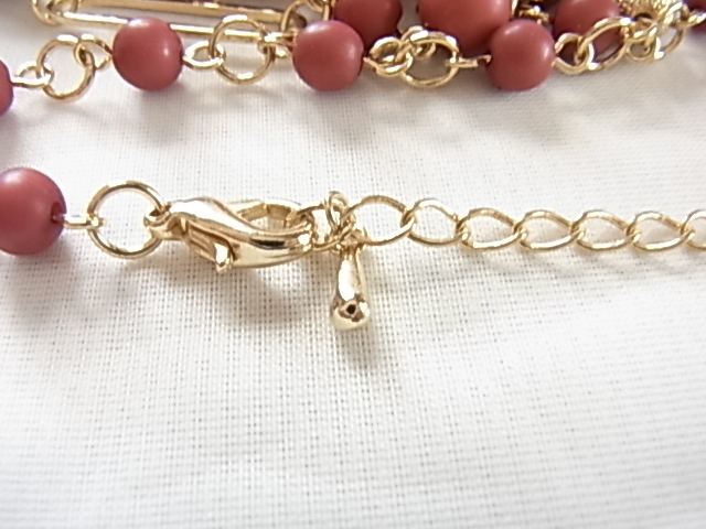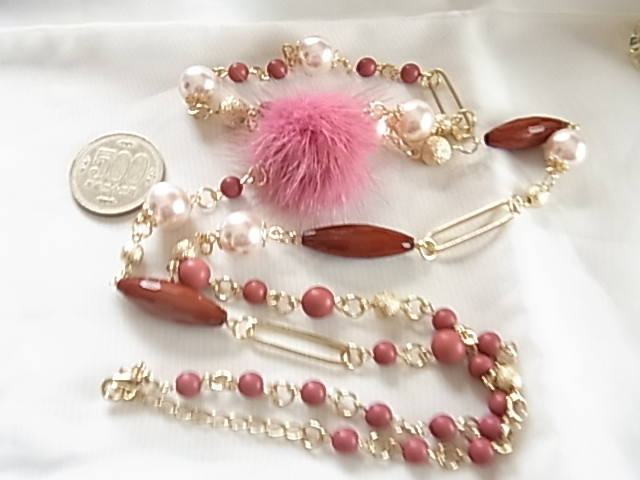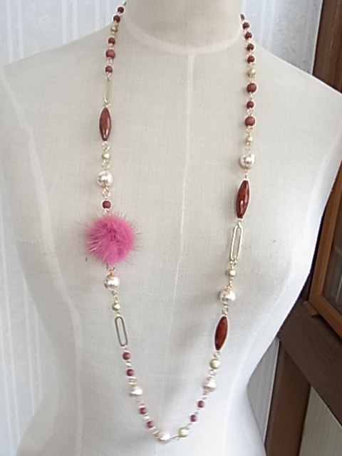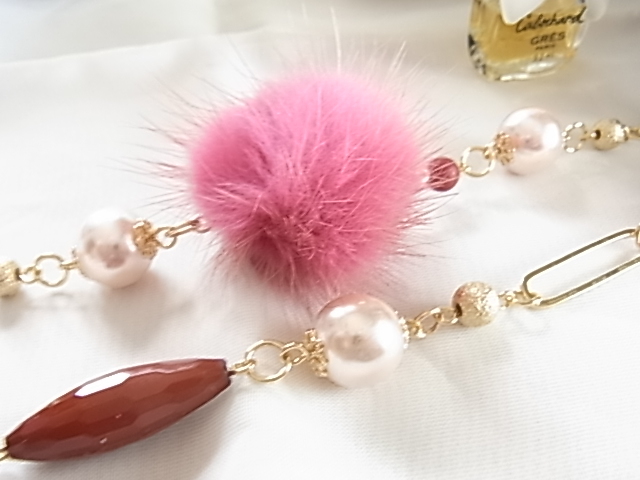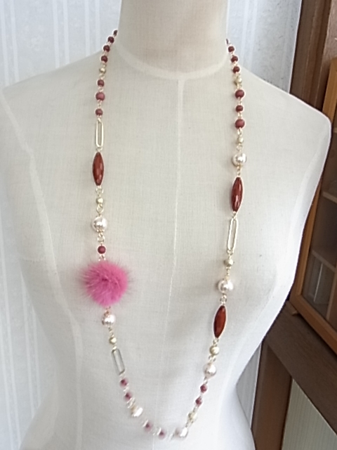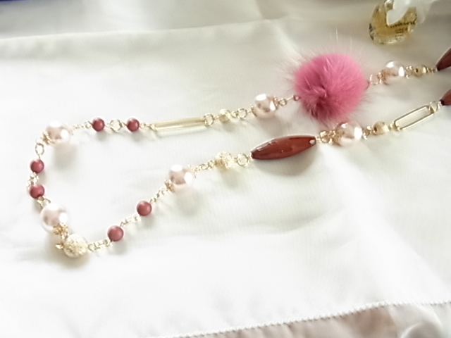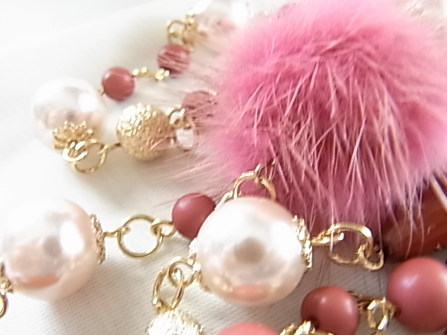 キュート チェリーピンクのファーが印象的 レッド系のストーンにフレッシュピンクのパールトーンストーンが可愛い ロングネックレス◎◎