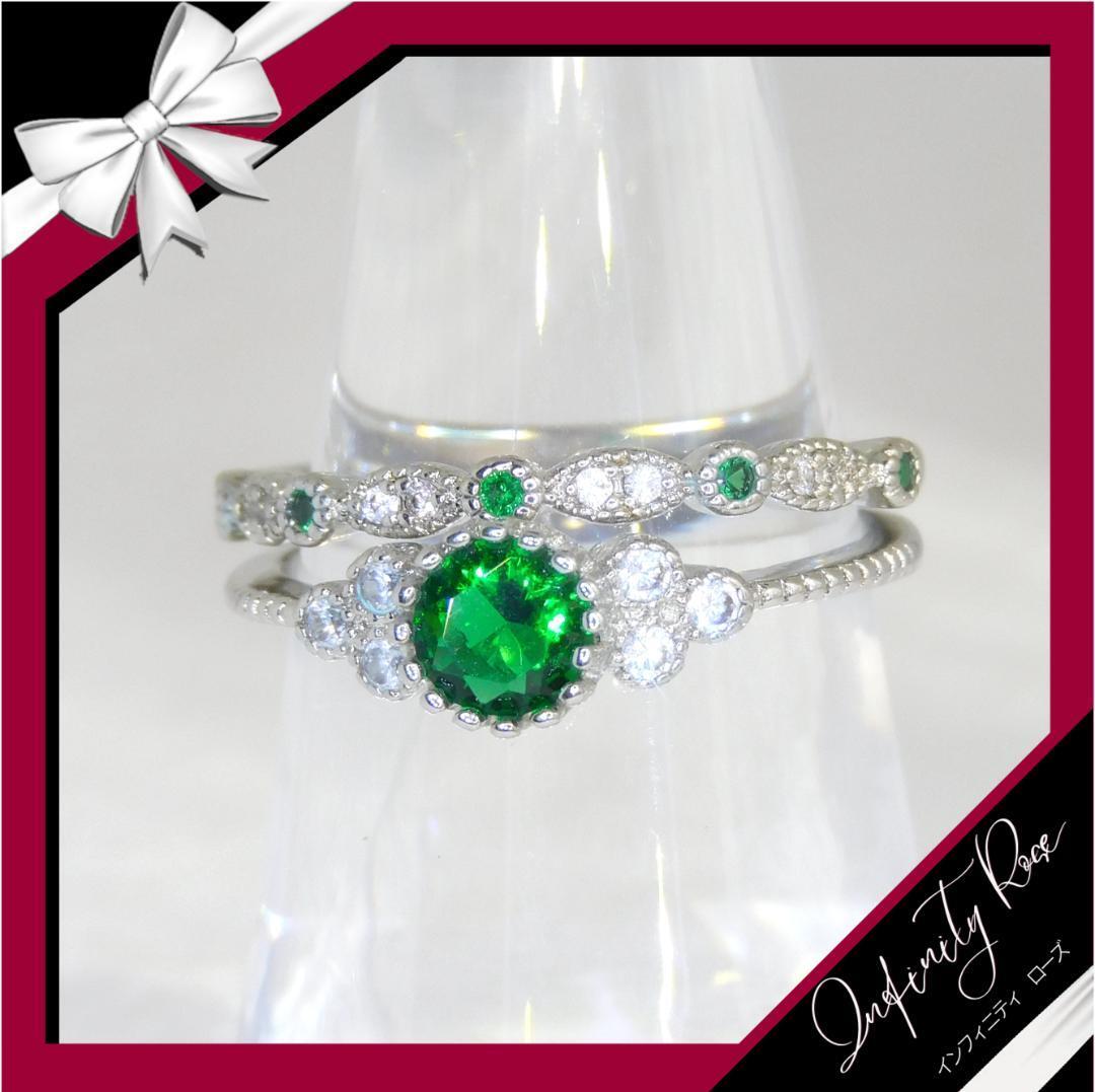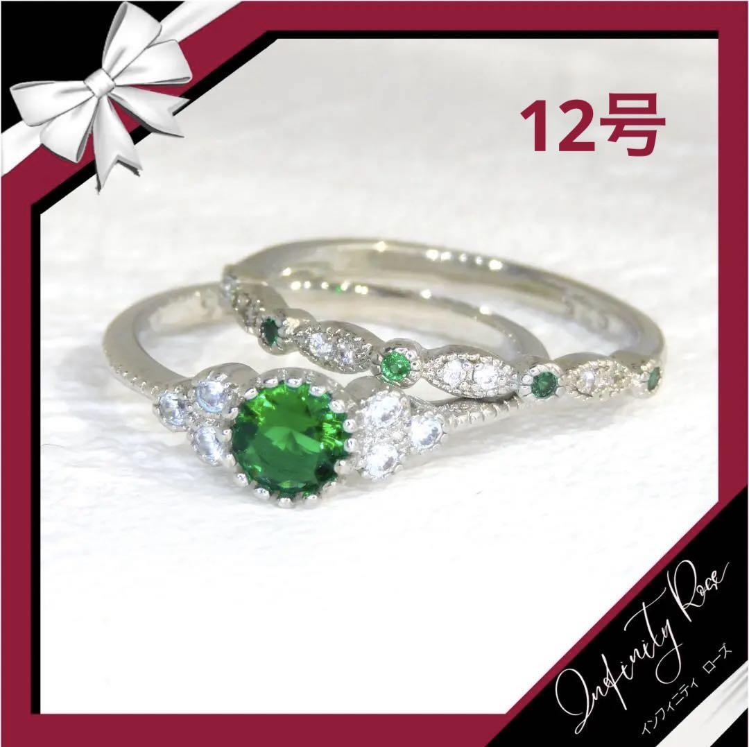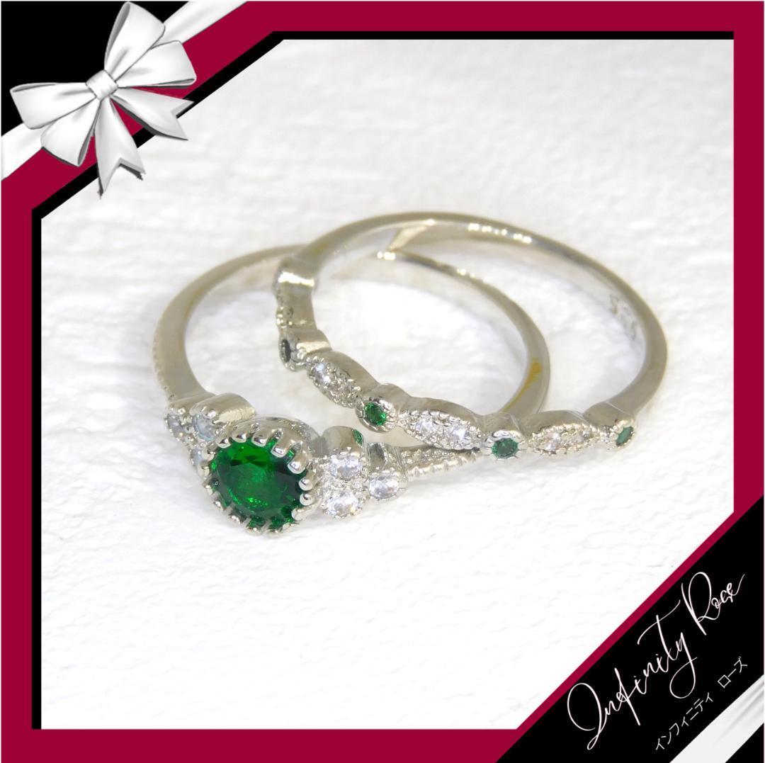 (R057SG)12号 グリーンクリスタル2本セットペアエンゲージ細リング 指輪