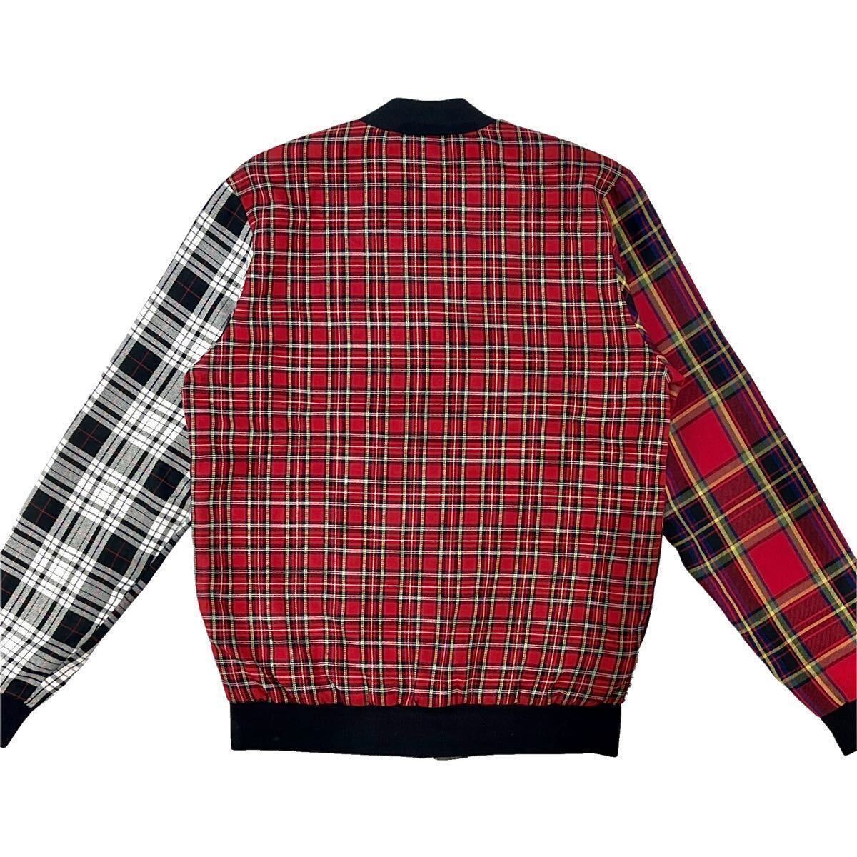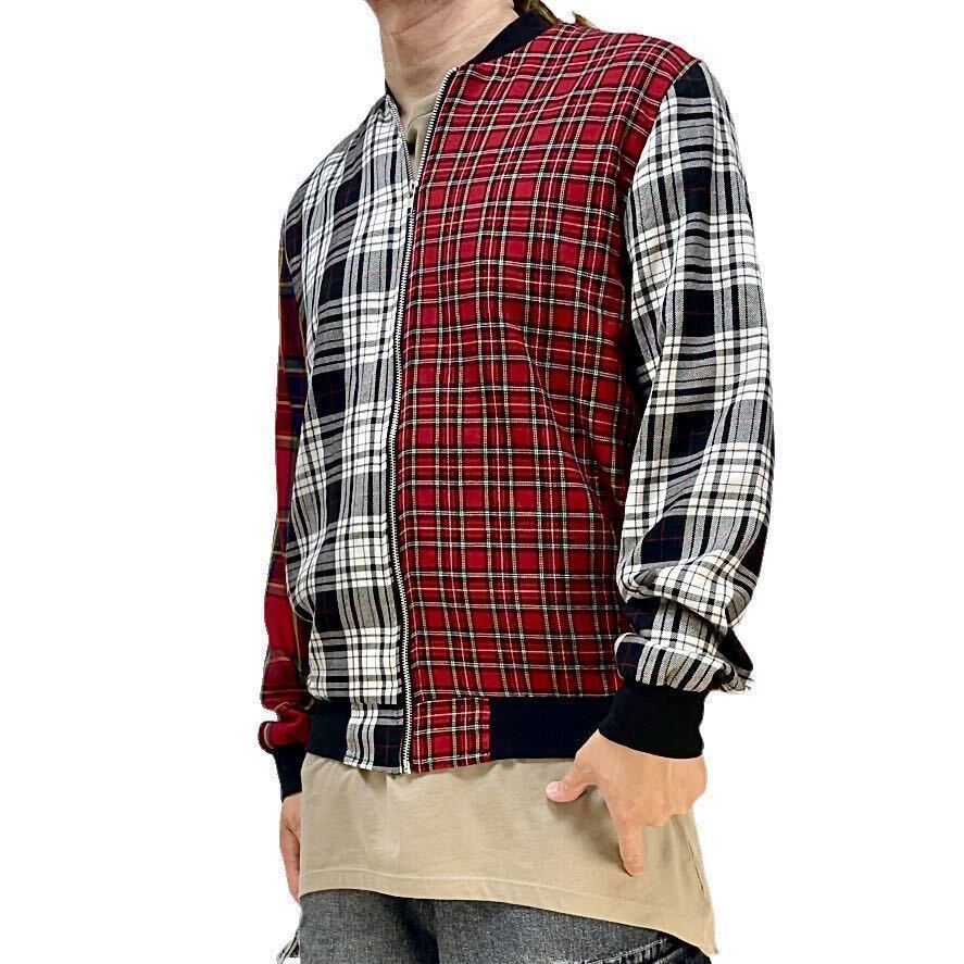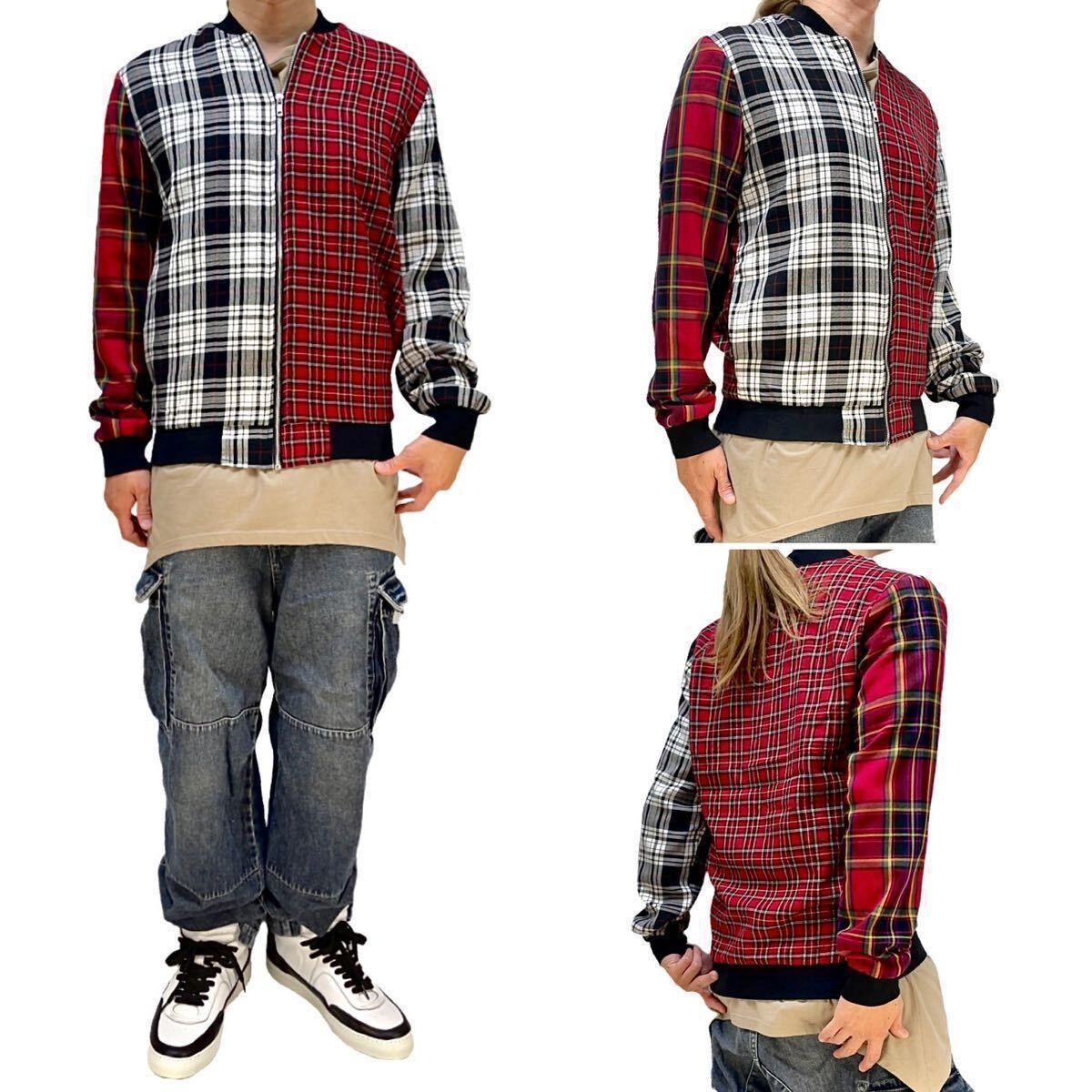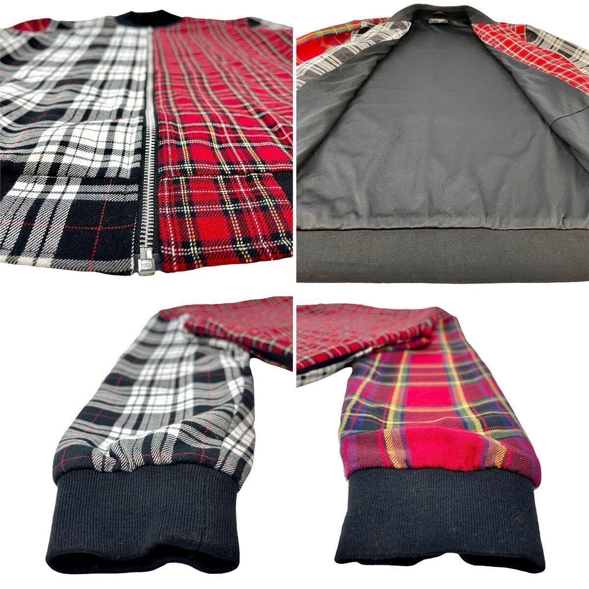 左右身頃と両袖、背中がそれぞれ違うパターンのタータンチェック切り替えになったアシンメトリージャケット。