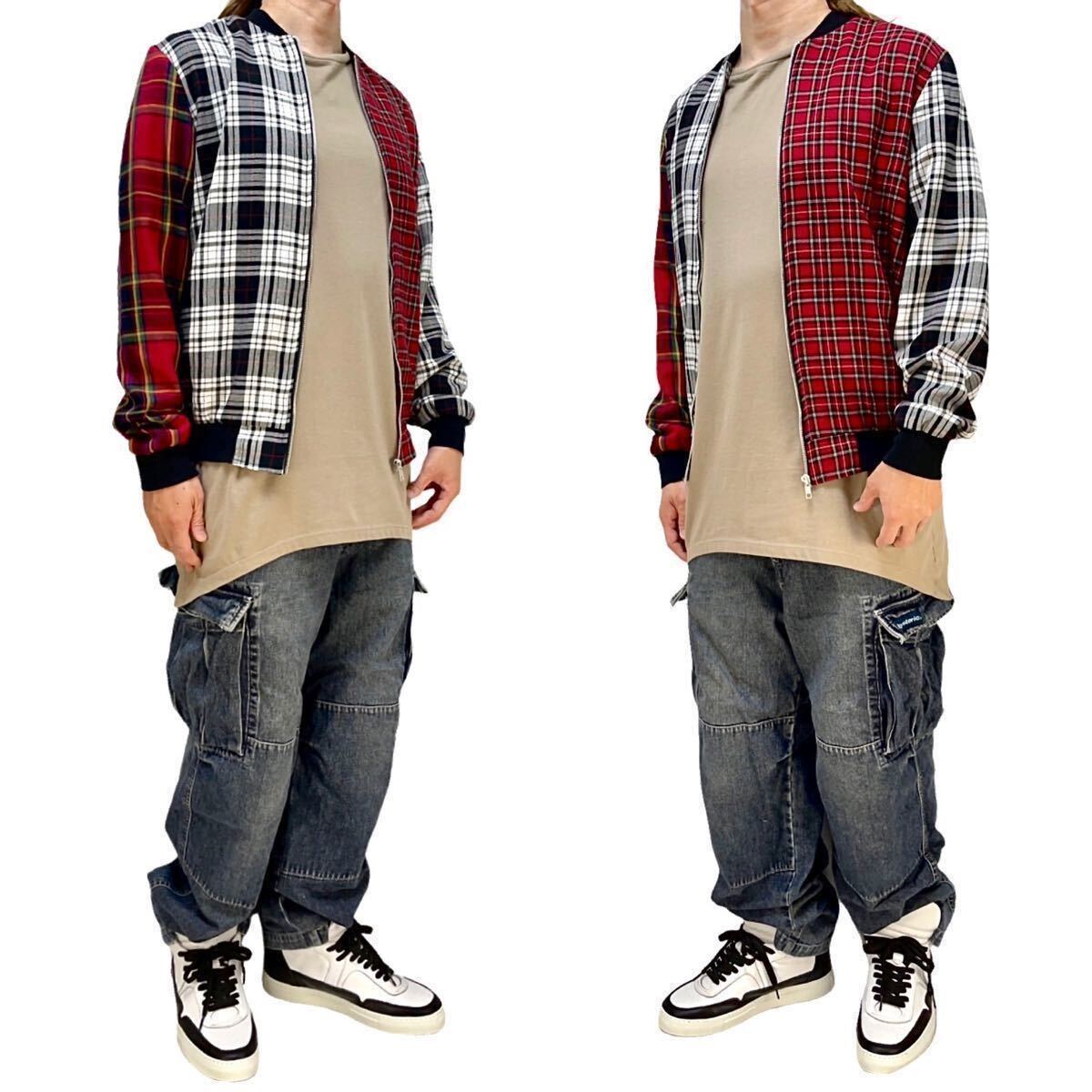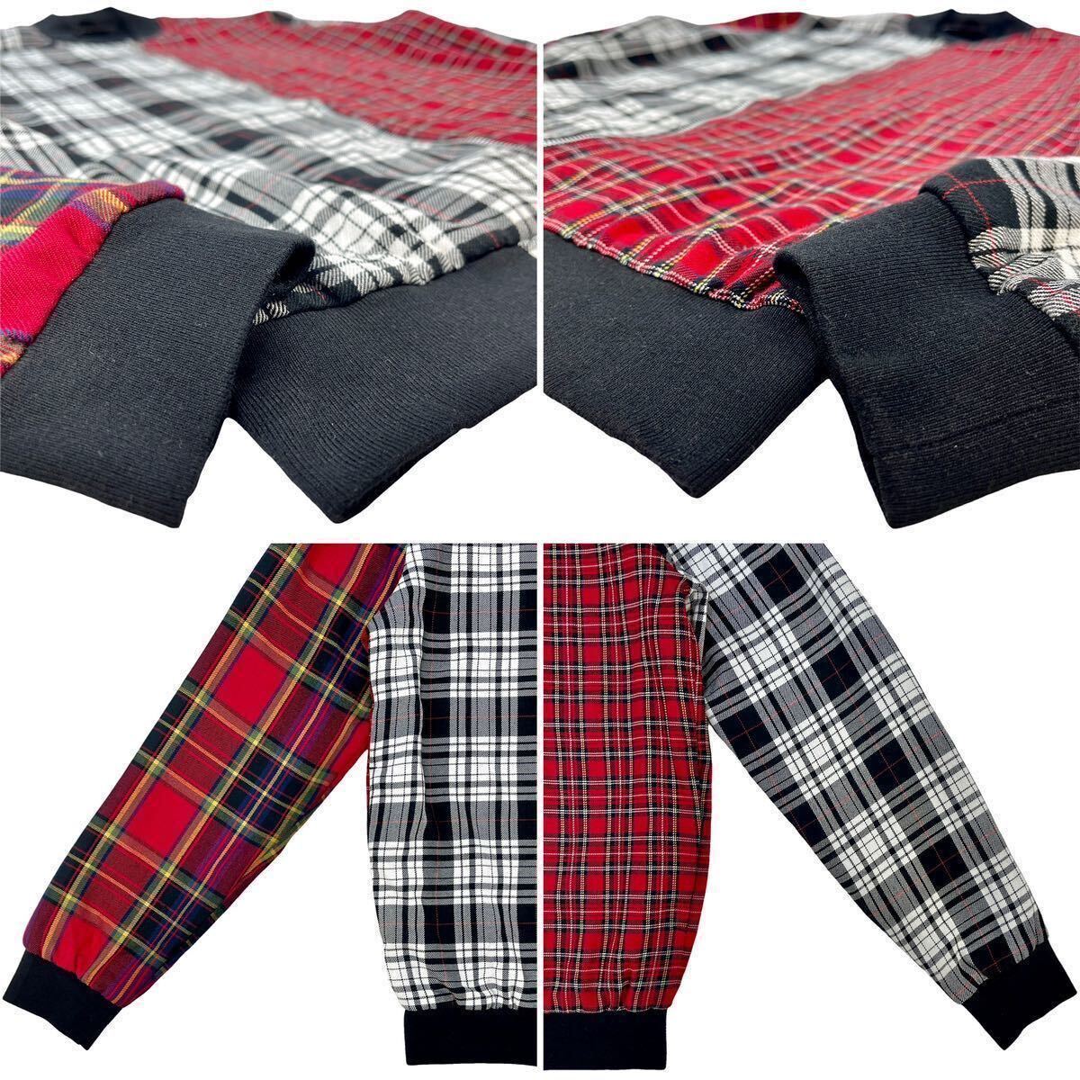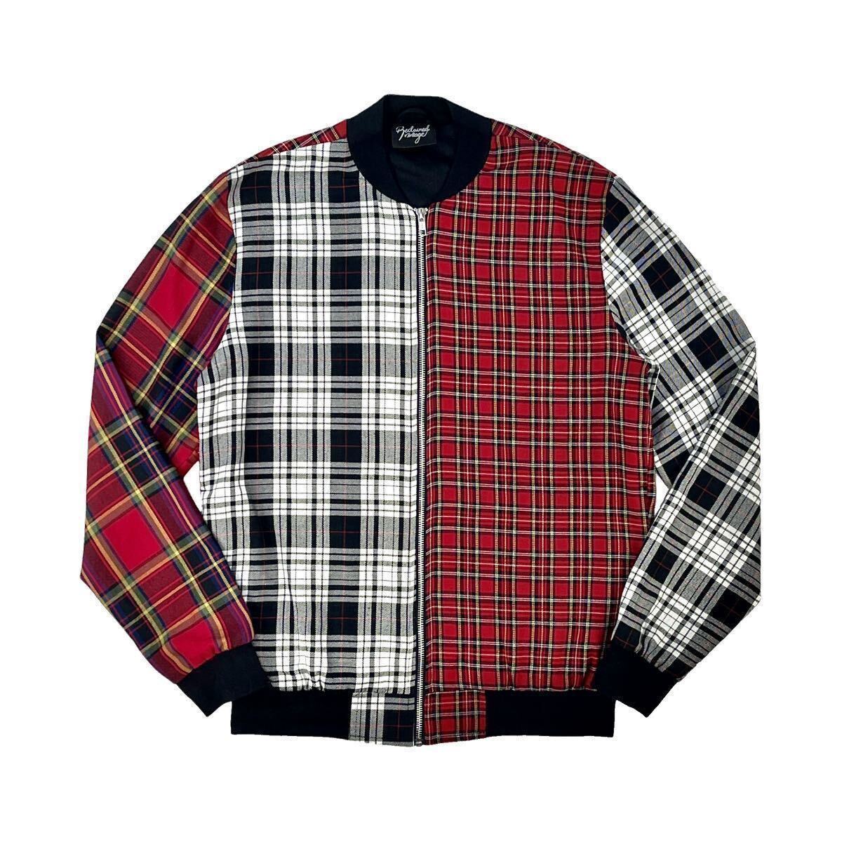 左右身頃と両袖、背中がそれぞれ違うパターンのタータンチェック切り替えになったアシンメトリージャケット。