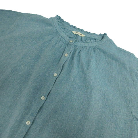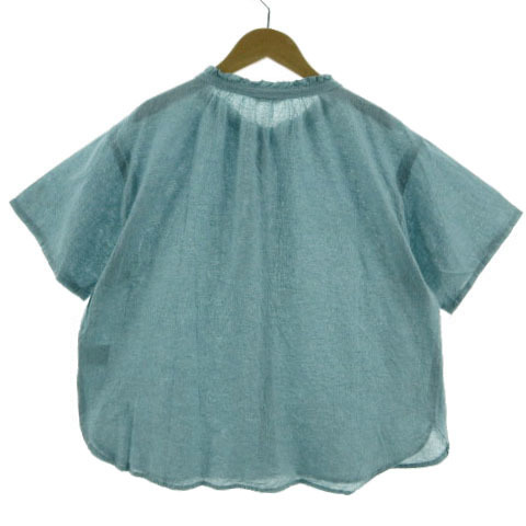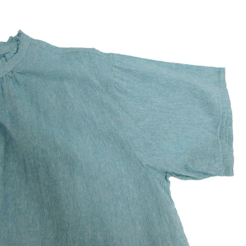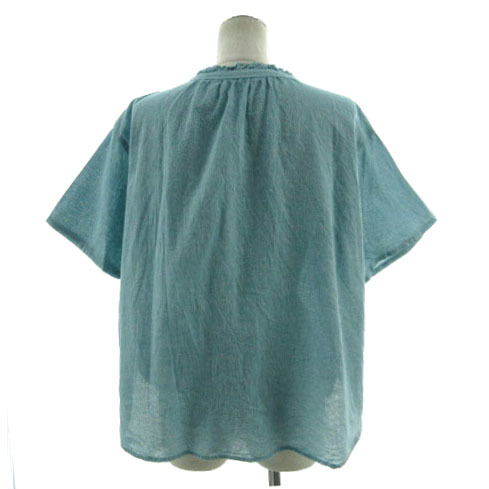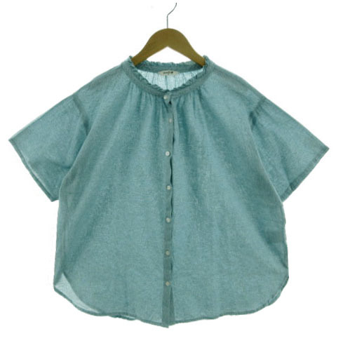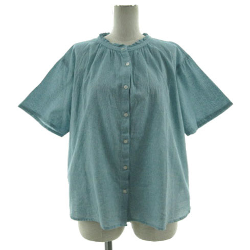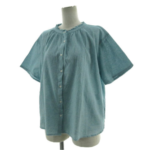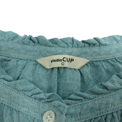 スタディオクリップ Studio Clip シャツ バンドカラー フリルネック ギャザー ワイドシルエット 半袖 コットン ブルー系 青緑 L