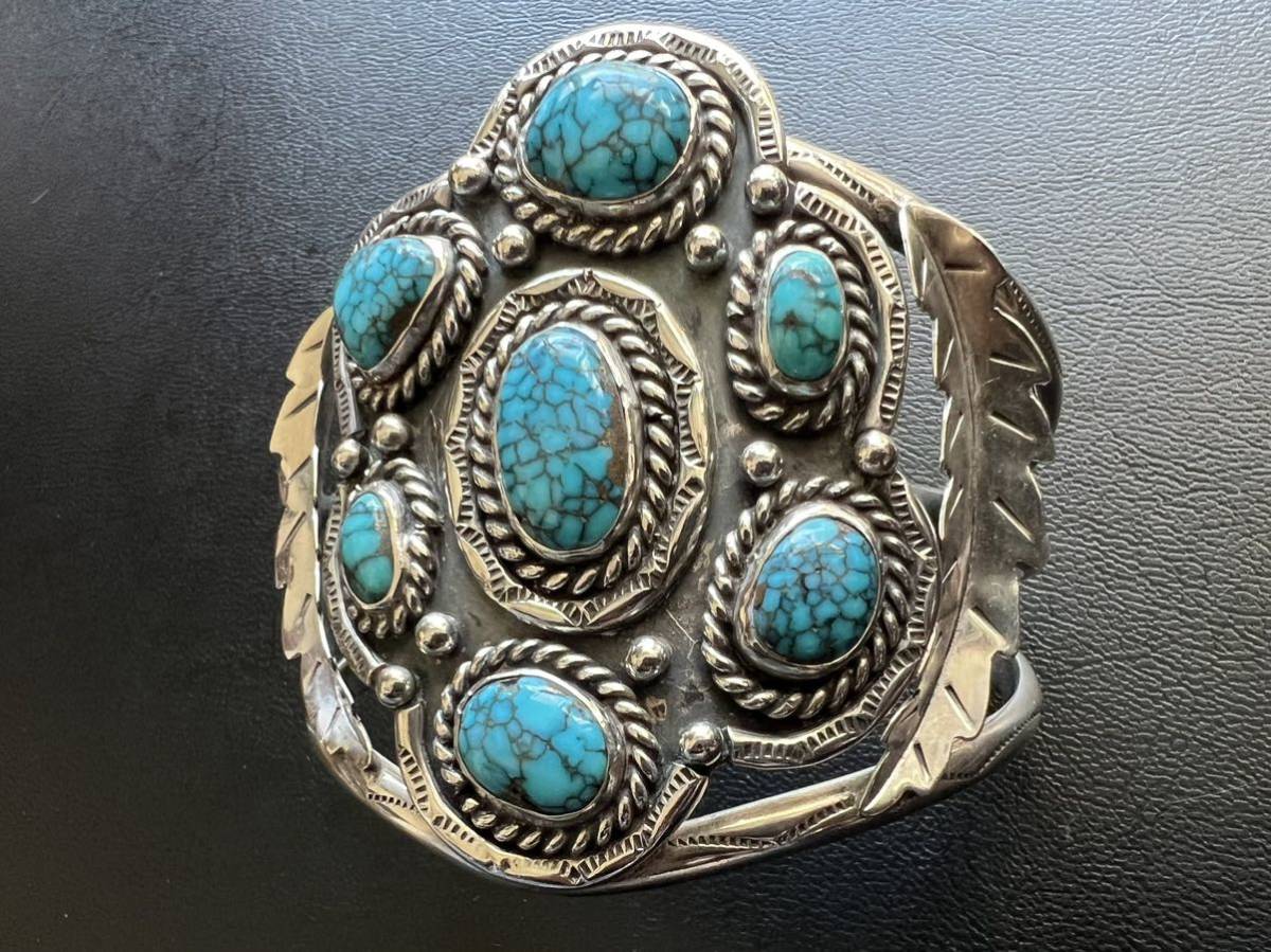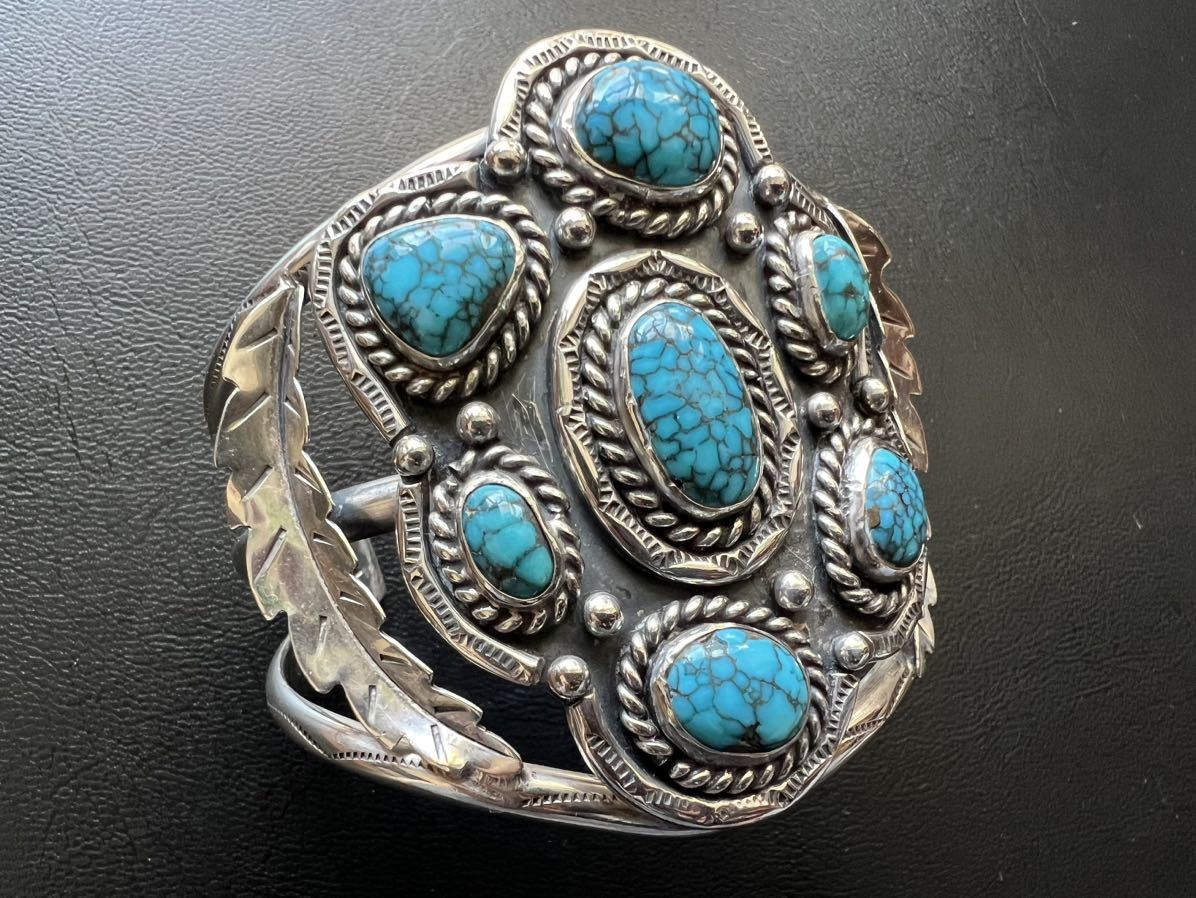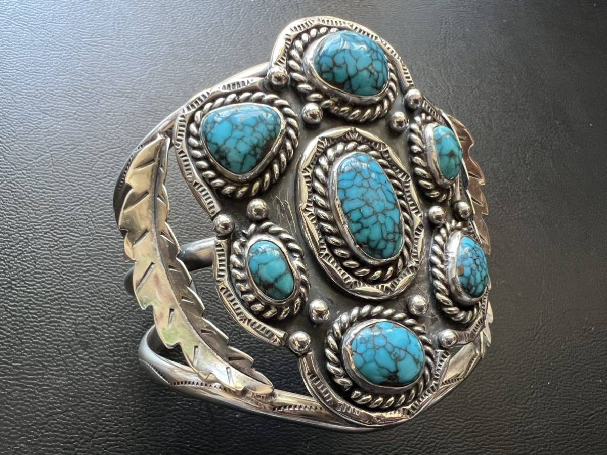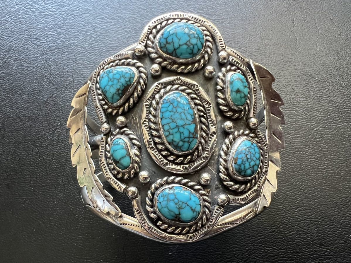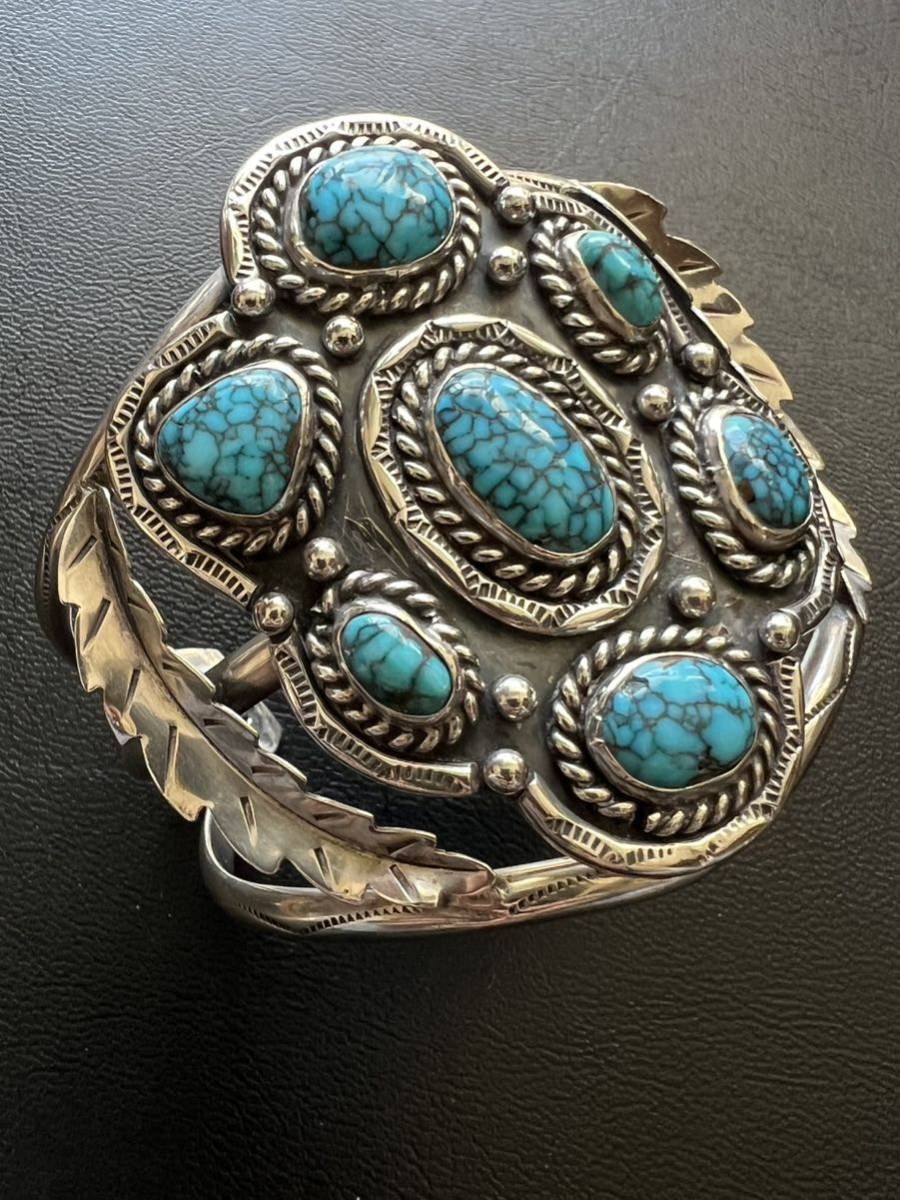 こちらのOLD PAWNの1960~70年代に制作された作品で、3本のスプレッドシャンクに縦60mmオーバーの精巧に作られたクラスタータイプのトップをセット、ウェブの美しいハイグレードのネバダブルー・ターコイズを散りばめたその周りをドロップ・スタンプ・ロープワークにて飾り、サイドをリーフであしらったで存在感のある見事なクラスターバングルになります。