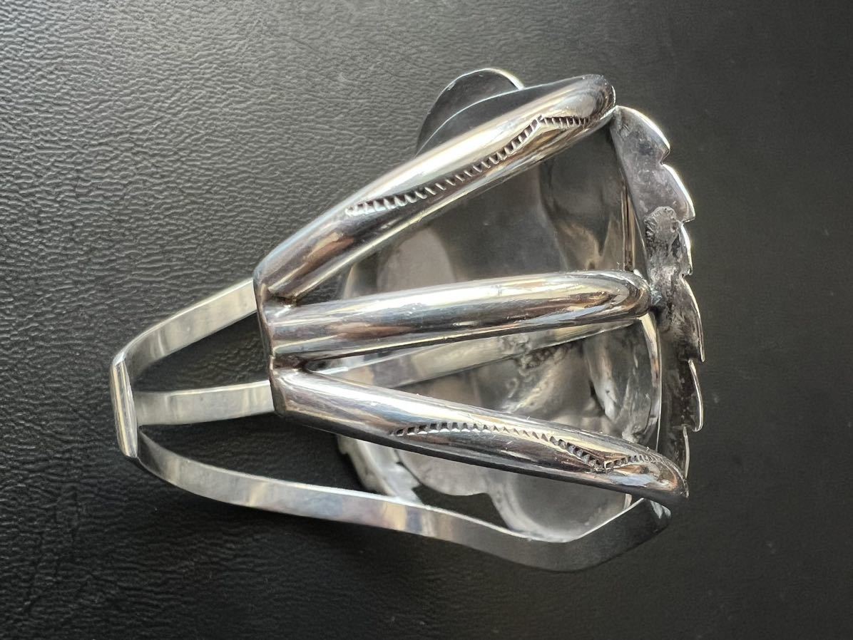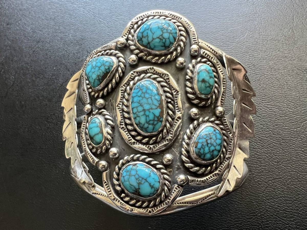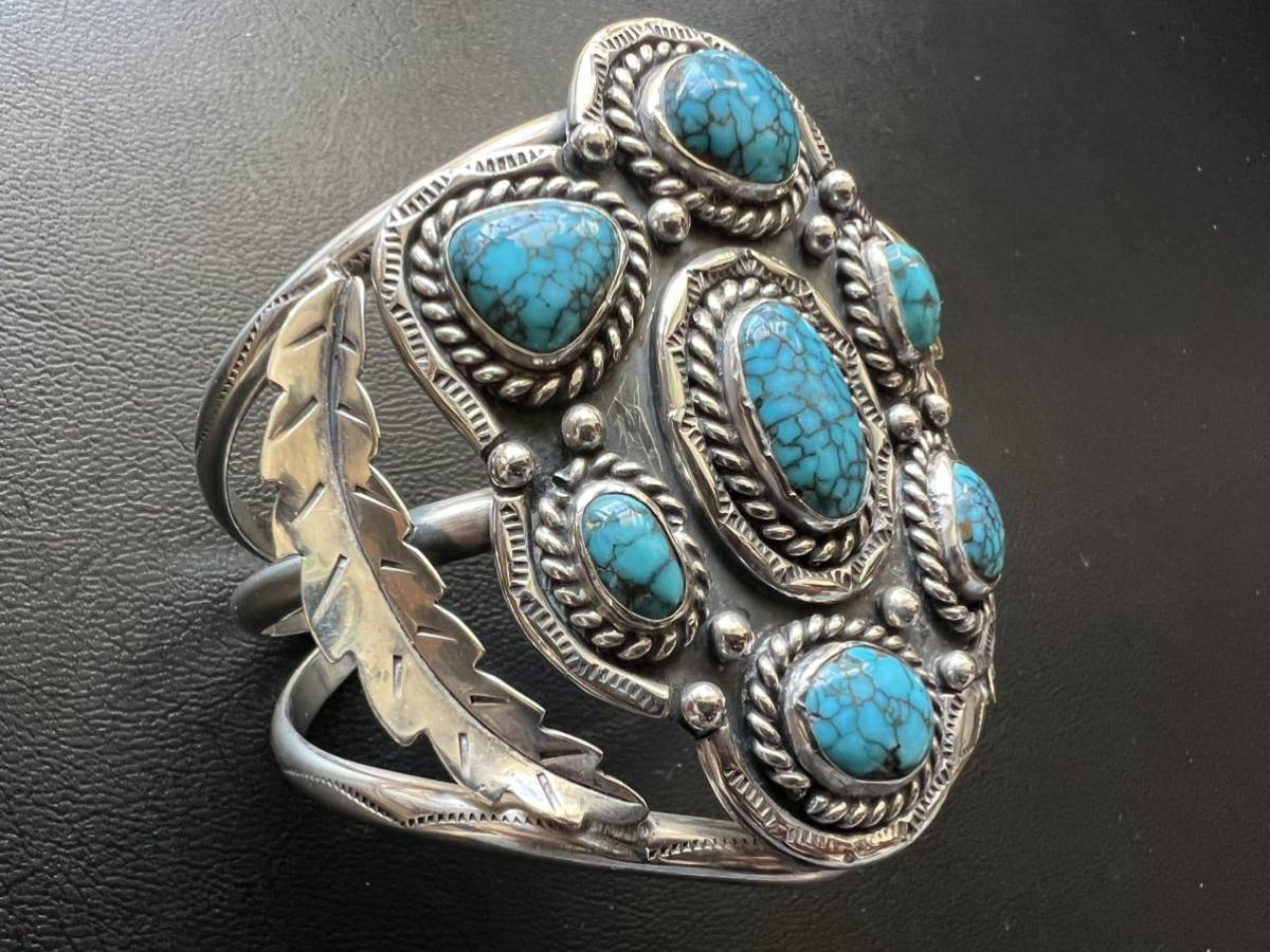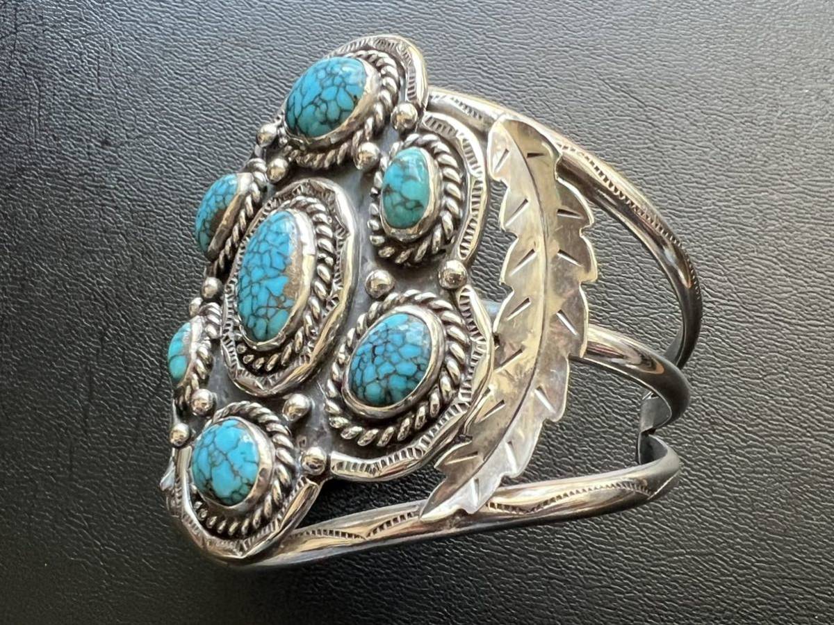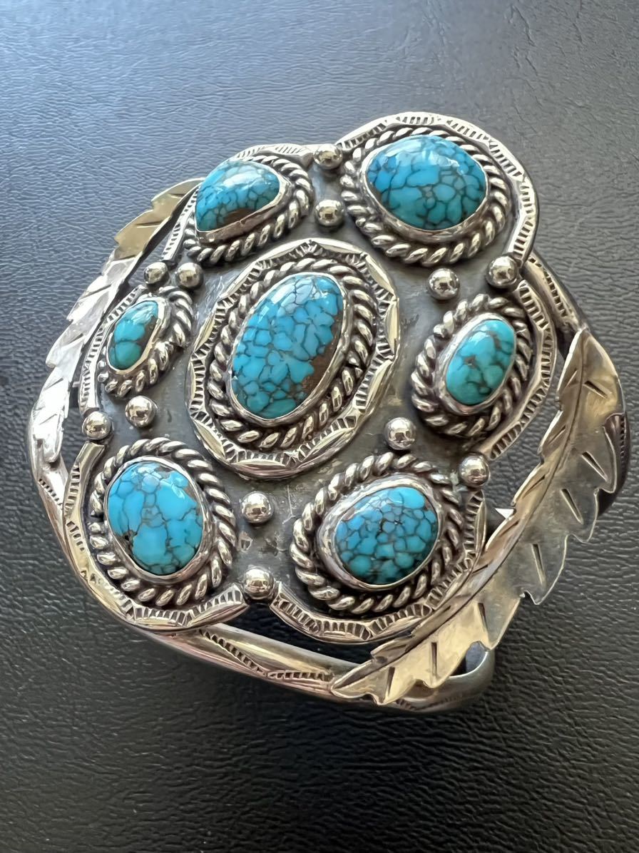 こちらのOLD PAWNの1960~70年代に制作された作品で、3本のスプレッドシャンクに縦60mmオーバーの精巧に作られたクラスタータイプのトップをセット、ウェブの美しいハイグレードのネバダブルー・ターコイズを散りばめたその周りをドロップ・スタンプ・ロープワークにて飾り、サイドをリーフであしらったで存在感のある見事なクラスターバングルになります。
