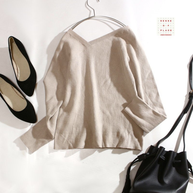 もっちりリブニット、デザインVネック、無地シンプルデザインです。