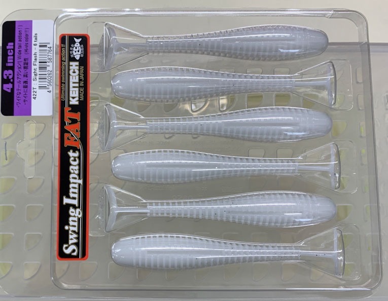 ケイテック スイングインパクトファット 4.3インチ。1パック6本入り。1尾重量:10.3g、推奨フックサイズ:オフセットフック #3/0。