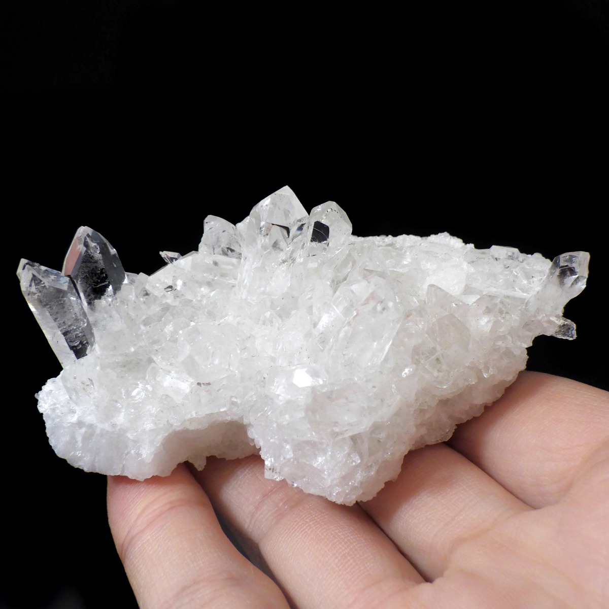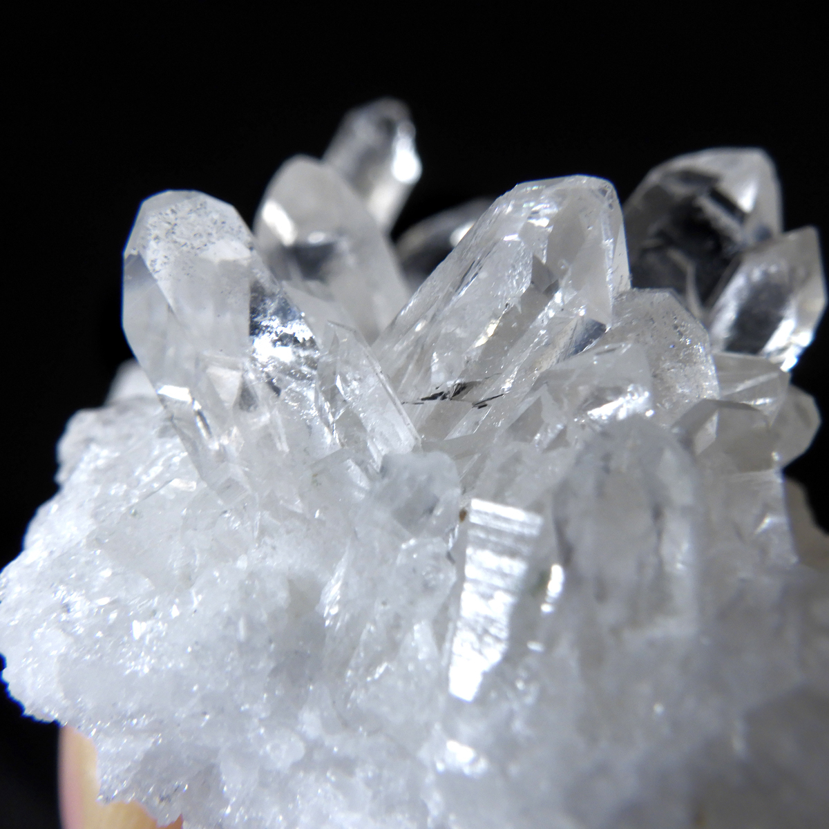 ブラジル トマスゴンサガ産 の水晶クラスターです。トマスゴンサガ産の水晶の特徴は、照りと艶。光沢が強いため、驚くほどキラキラとしています。また、水晶柱が放射線状に伸びて立体的な構造を作っているものが多く、「これぞ、水晶クラスター」という形状をしています。非常に透明度の高い大小様々な結晶が複雑に絡み合い、見る角度によって様々な表情を見せる大変美しいクラスターです。
