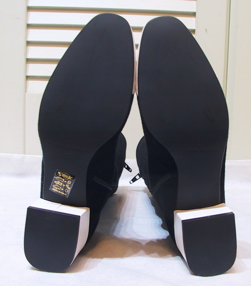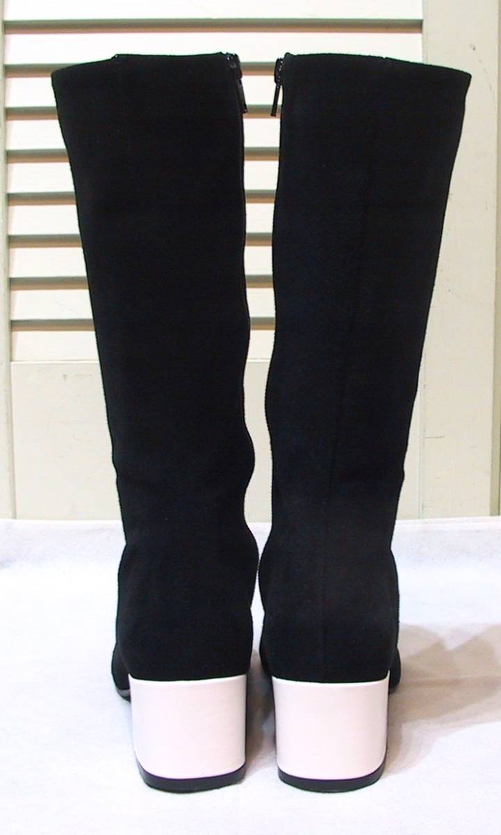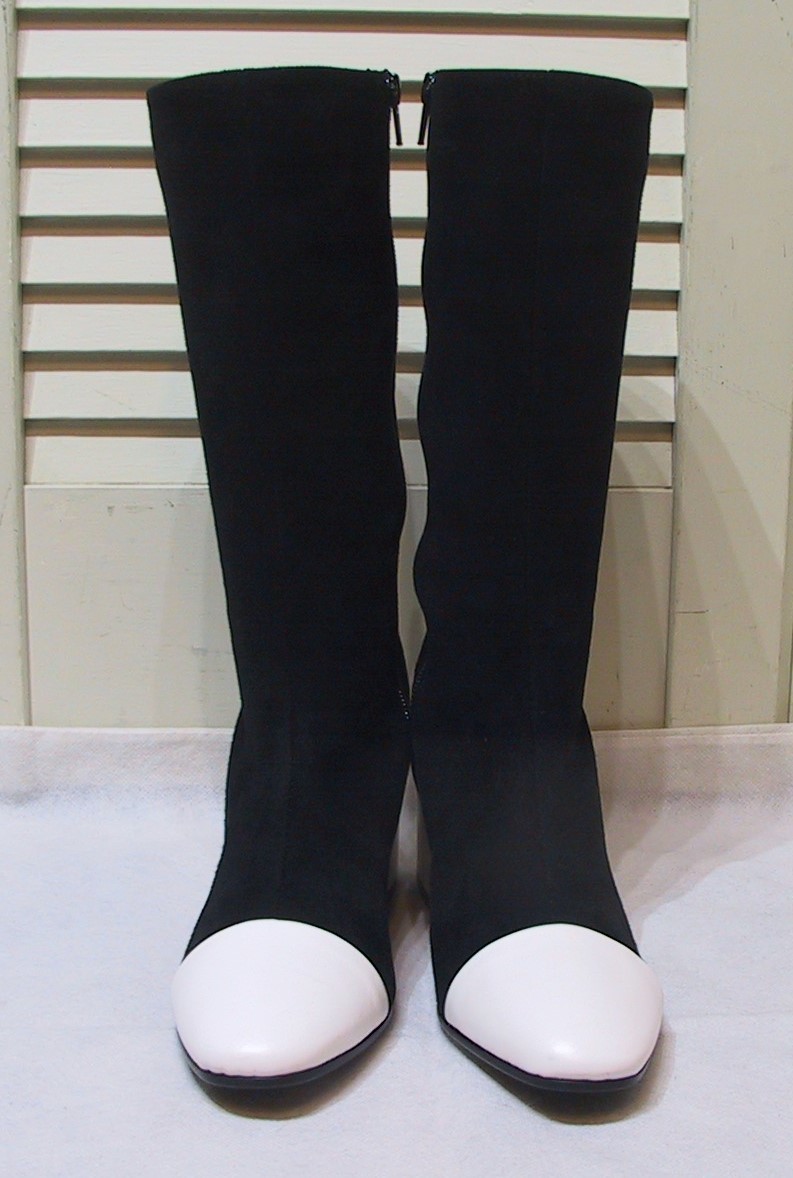 GIANNI DEL PRETE/ジャンニデルプレーテ、本革レザーxスエード(黒部分はスエード、白部分はレザー)、ロングブーツ/セミロングブーツ、内側フルジップUP、色は黒x白、インソールクッション入り、イタリア製です。新品未使用展示品です。サイズ:37/23.5㎝、ヒールの高さ5.5㎝、アウトソール最大幅7.8㎝、ブーツの高さ33㎝、筒周り33㎝、足首周り25㎝。送料は1440円(北海道2040円、沖縄は1810円)になります。値下しました!