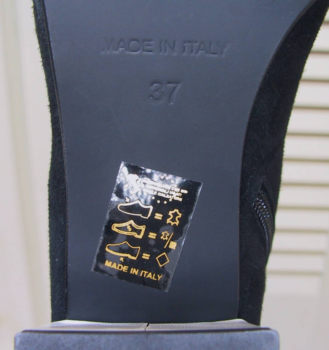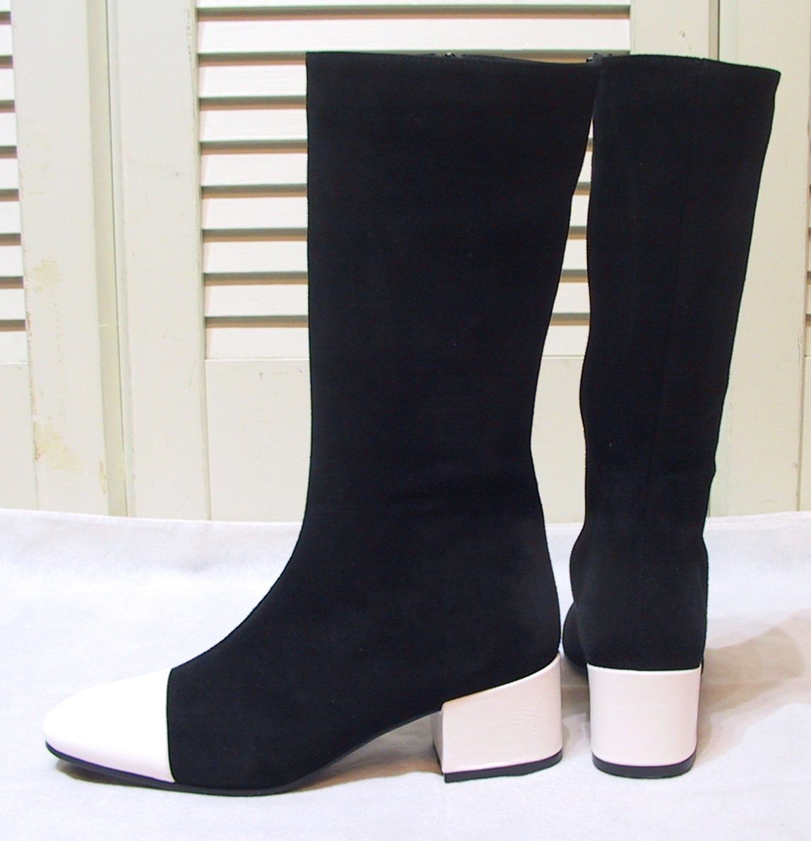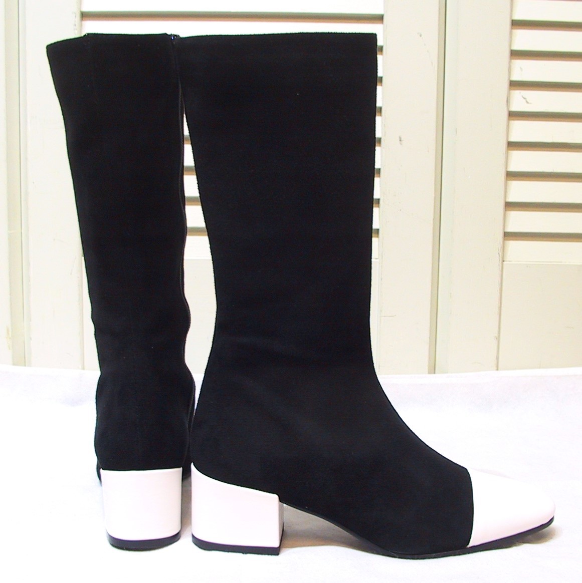GIANNI DEL PRETE/ジャンニデルプレーテ、本革レザーxスエード(黒部分はスエード、白部分はレザー)、ロングブーツ/セミロングブーツ、内側フルジップUP、色は黒x白、インソールクッション入り、イタリア製です。新品未使用展示品です。サイズ:37/23.5㎝、ヒールの高さ5.5㎝、アウトソール最大幅7.8㎝、ブーツの高さ33㎝、筒周り33㎝、足首周り25㎝。送料は1440円(北海道2040円、沖縄は1810円)になります。値下しました!