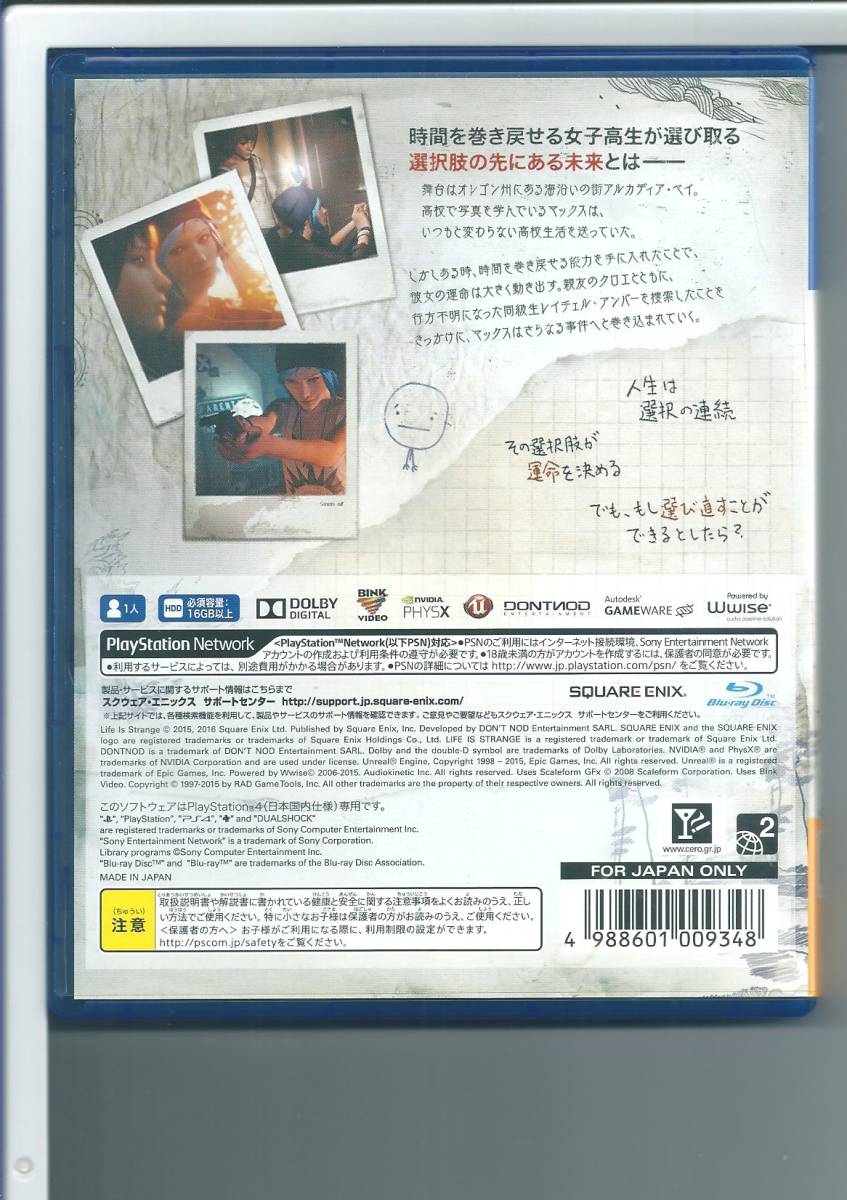 | ●JANコード4988601009348 t1 ☆PS4 ライフ イズ ストレンジ ●商品の状態 ソフト・説明書に使用感、ケースにスレ・イタミがあります。 |