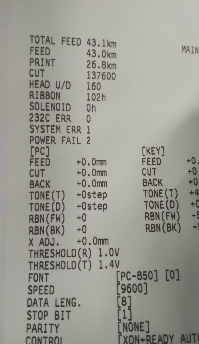 【中古品】 ◆トータルフィード:43.1km カッター:137600 ◆使用によるキズ、汚れ、シール跡、落書き等があります。 ◆通電、起動動作確認済。 ◆印字動作確認済。 ※カッターエラーが発生しました。 ◆動作確認は以上となります。 |